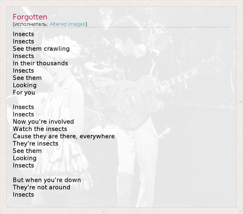Insects Insects See them crawling Insects In their thousands Insects See them Looking For you Insects Insects Now you're involved Watch the insects Cause they are there, everywhere They're insects See them Looking Insects But when you're down They're not around Insects