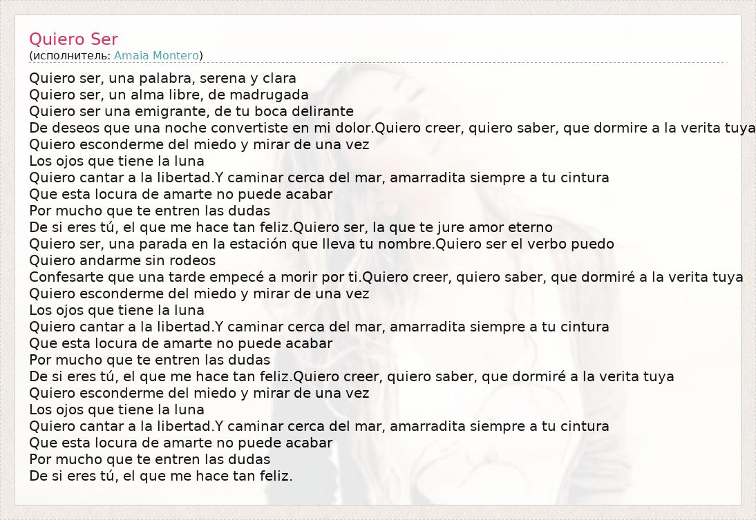 Quiero ser, una palabra, serena y clara Quiero ser, un alma libre, de madrugada Quiero ser una emigrante, de tu boca delirante De deseos que una noche convertiste en mi dolor.Quiero creer, quiero saber, que dormire a la verita tuya Quiero esconderme del miedo y mirar de una vez Los ojos que tiene la luna Quiero cantar a la libertad.Y caminar cerca del mar, amarradita siempre a tu cintura Que esta locura de amarte no puede acabar Por mucho que te entren las dudas De si eres tú, el que me hace tan feliz.Quiero ser, la que te jure amor eterno Quiero ser, una parada en la estación que lleva tu nombre.Quiero ser el verbo puedo Quiero andarme sin rodeos Confesarte que una tarde empecé a morir por ti.Quiero creer, quiero saber, que dormiré a la verita tuya Quiero esconderme del miedo y mirar de una vez Los ojos que tiene la luna Quiero cantar a la libertad.Y caminar cerca del mar, amarradita siempre a tu cintura Que esta locura de amarte no puede acabar Por mucho que te entren las dudas De si eres tú, el que me hace tan feliz.Quiero creer, quiero saber, que dormiré a la verita tuya Quiero esconderme del miedo y mirar de una vez Los ojos que tiene la luna Quiero cantar a la libertad.Y caminar cerca del mar, amarradita siempre a tu cintura Que esta locura de amarte no puede acabar Por mucho que te entren las dudas De si eres tú, el que me hace tan feliz.