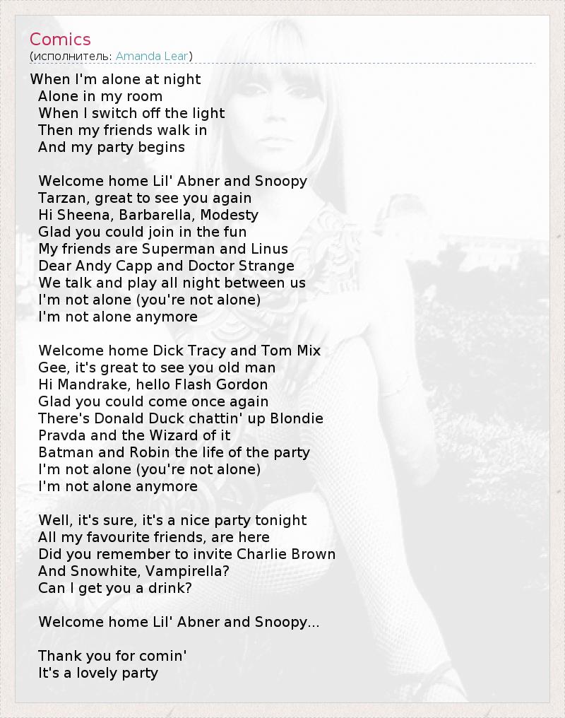 When I'm alone at night Alone in my room When I switch off the light Then my friends walk in And my party begins Welcome home Lil' Abner and Snoopy Tarzan, great to see you again Hi Sheena, Barbarella, Modesty Glad you could join in the fun My friends are Superman and Linus Dear Andy Capp and Doctor Strange We talk and play all night between us I'm not alone (you're not alone) I'm not alone anymore Welcome home Dick Tracy and Tom Mix Gee, it's great to see you old man Hi Mandrake, hello Flash Gordon Glad you could come once again There's Donald Duck chattin' up Blondie Pravda and the Wizard of it Batman and Robin the life of the party I'm not alone (you're not alone) I'm not alone anymore Well, it's sure, it's a nice party tonight All my favourite friends, are here Did you remember to invite Charlie Brown And Snowhite, Vampirella? Can I get you a drink? Welcome home Lil' Abner and Snoopy... Thank you for comin' It's a lovely party
