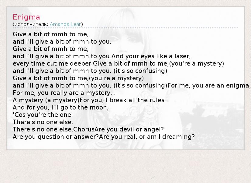 Give a bit of mmh to me, and I'll give a bit of mmh to you. Give a bit of mmh to me, and I'll give a bit of mmh to you.And your eyes like a laser, every time cut me deeper.Give a bit of mmh to me,(you're a mystery) and I'll give a bit of mmh to you. (it's so confusing) Give a bit of mmh to me,(you're a mystery) and I'll give a bit of mmh to you. (it's so confusing)For me, you are an enigma, For me, you really are a mystery... A mystery (a mystery)For you, I break all the rules And for you, I'll go to the moon, 'Cos you're the one There's no one else. There's no one else.ChorusAre you devil or angel? Are you question or answer?Are you real, or am I dreaming?