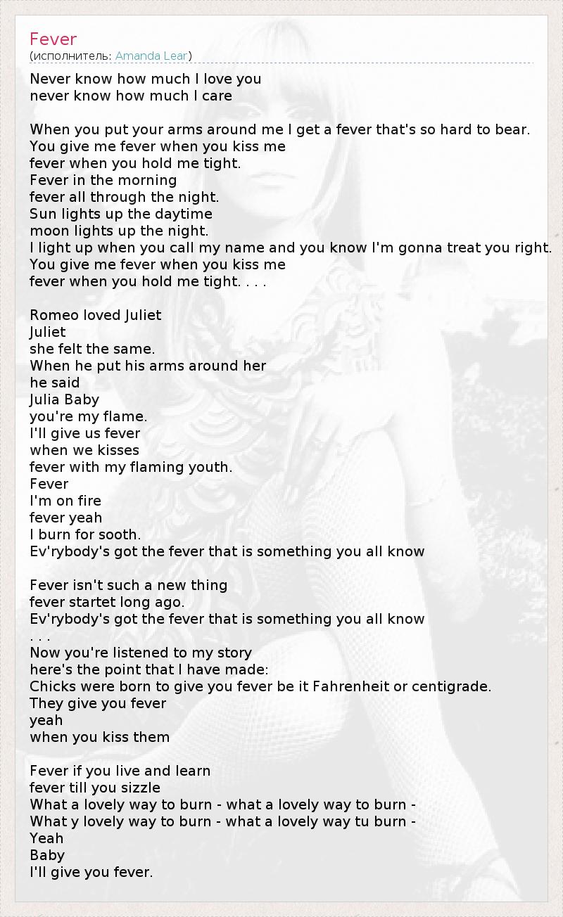 Never know how much I love you never know how much I care When you put your arms around me I get a fever that's so hard to bear. You give me fever when you kiss me fever when you hold me tight. Fever in the morning fever all through the night. Sun lights up the daytime moon lights up the night. I light up when you call my name and you know I'm gonna treat you right. You give me fever when you kiss me fever when you hold me tight. . . . Romeo loved Juliet Juliet she felt the same. When he put his arms around her he said Julia Baby you're my flame. I'll give us fever when we kisses fever with my flaming youth. Fever I'm on fire fever yeah I burn for sooth. Ev'rybody's got the fever that is something you all know Fever isn't such a new thing fever startet long ago. Ev'rybody's got the fever that is something you all know . . . Now you're listened to my story here's the point that I have made: Chicks were born to give you fever be it Fahrenheit or centigrade. They give you fever yeah when you kiss them Fever if you live and learn fever till you sizzle What a lovely way to burn - what a lovely way to burn - What y lovely way to burn - what a lovely way tu burn - Yeah Baby I'll give you fever.