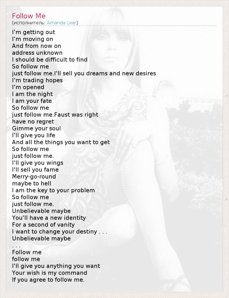 I'm getting out I'm moving on And from now on address unknown I should be difficult to find So follow me just follow me.I'll sell you dreams and new desires I'm trading hopes I'm opened I am the night I am your fate So follow me just follow me.Faust was right have no regret Gimme your soul I'll give you life And all the things you want to get So follow me just follow me. I'll give you wings I'll sell you fame Merry-go-round maybe to hell I am the key to your problem So follow me just follow me. Unbelievable maybe You'll have a new identity For a second of vanity I want to change your destiny . . . Unbelievable maybe . . . Follow me follow me I'll give you anything you want Your wish is my command If you agree to follow me.