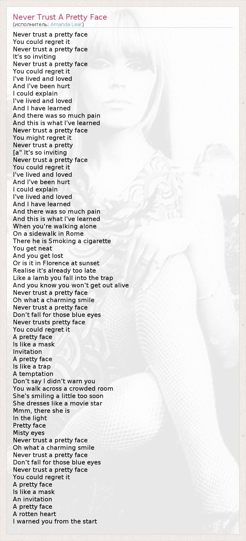 Never trust a pretty face You could regret it Never trust a pretty face It's so inviting Never trust a pretty face You could regret it I've lived and loved And I've been hurt I could explain I've lived and loved And I have learned And there was so much pain And this is what I've learned Never trust a pretty face You might regret it Never trust a pretty [a" It's so inviting Never trust a pretty face You could regret it I've lived and loved And I've been hurt I could explain I've lived and loved And I have learned And there was so much pain And this is what I've learned When you're walking alone On a sidewalk in Rome There he is Smoking a cigarette You get neat And you get lost Or is it in Florence at sunset Realise it's already too late Like a lamb you fall into the trap And you know you won't get out alive Never trust a pretty face Oh what a charming smile Never trust a pretty face Don't fall for those blue eyes Never trusts pretty face You could regret it A pretty face Is like a mask Invitation A pretty face Is like a trap A temptation Don't say I didn't warn you You walk across a crowded room She's smiling a little too soon She dresses like a movie star Mmm, there she is In the light Pretty face Misty eyes Never trust a pretty face Oh what a charming smile Never trust a pretty face Don't fall for those blue eyes Never trust a pretty face You could regret it A pretty face Is like a mask An invitation A pretty face A rotten heart I warned you from the start