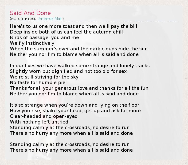 Еще один тост для нас, и мы оплатим счет. В глубине каждого из нас уже чувствуется осенний холод. Перелетные птицы, ты и я, Мы летим по инстинкту. Кода лето кончается и темные тучи скрывают солнце, Ни ты, ни я не виноваты, раз все уже сказано и сделано... За наши жизни мы прошли несколько странных одиноких дорог, Немного потрепаны, но вполне достойные и не слишком старые для секса, Мы все еще боремся за это небо. Скромный пирог совсем безвкусен.... Спасибо за твою щедрую любовь, спасибо за веселье, Ни ты, ни я не виноваты, раз все уже сказано и сделано... Так странно, когда ты подавлен и лежишь на полу, Но ты поднимаешься, встряхиваешь головой и просишь еще... Здравомыслящие, с широко открытыми глазами, Испробовавшие все... Тихо стоим на перекрестке, нет желания куда-то бежать, Больше некуда спешить, когда все уже сказано и сделано... Тихо стоим на перекрестке, нет желания куда-то бежать, Больше некуда спешить, когда все уже сказано и сделано...