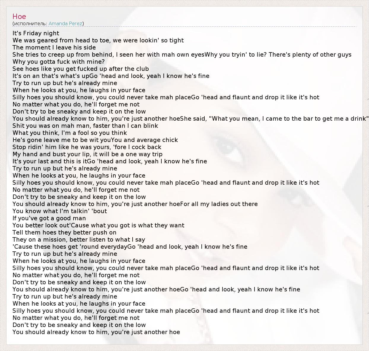 It's Friday night We was geared from head to toe, we were lookin' so tight The moment I leave his side She tries to creep up from behind, I seen her with mah own eyesWhy you tryin' to lie? There's plenty of other guys Why you gotta fuck with mine? See hoes like you get fucked up after the club It's on an that's what's upGo 'head and look, yeah I know he's fine Try to run up but he's already mine When he looks at you, he laughs in your face Silly hoes you should know, you could never take mah placeGo 'head and flaunt and drop it like it's hot No matter what you do, he'll forget me not Don't try to be sneaky and keep it on the low You should already know to him, you're just another hoeShe said, "What you mean, I came to the bar to get me a drink" Shit you was on mah man, faster than I can blink What you think, I'm a fool so you think He's gone leave me to be wit youYou and average chick Stop ridin' him like he was yours, 'fore I cock back My hand and bust your lip, it will be a one way trip It's your last and this is itGo 'head and look, yeah I know he's fine Try to run up but he's already mine When he looks at you, he laughs in your face Silly hoes you should know, you could never take mah placeGo 'head and flaunt and drop it like it's hot No matter what you do, he'll forget me not Don't try to be sneaky and keep it on the low You should already know to him, you're just another hoeFor all my ladies out there You know what I'm talkin' 'bout If you've got a good man You better look out'Cause what you got is what they want Tell them hoes they better push on They on a mission, better listen to what I say 'Cause these hoes get 'round everydayGo 'head and look, yeah I know he's fine Try to run up but he's already mine When he looks at you, he laughs in your face Silly hoes you should know, you could never take mah placeGo 'head and flaunt and drop it like it's hot No matter what you do, he'll forget me not Don't try to be sneaky and keep it on the low You should already know to him, you're just another hoeGo 'head and look, yeah I know he's fine Try to run up but he's already mine When he looks at you, he laughs in your face Silly hoes you should know, you could never take mah placeGo 'head and flaunt and drop it like it's hot No matter what you do, he'll forget me not Don't try to be sneaky and keep it on the low You should already know to him, you're just another hoe