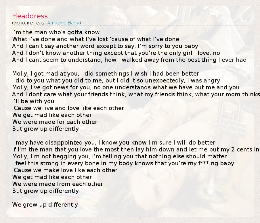 I'm the man who's gotta know What I've done and what I've lost 'cause of what I've done And I can't say another word except to say, I'm sorry to you baby And I don't know another thing except that you're the only girl I love, no And I cant seem to understand, how I walked away from the best thing I ever had Molly, I got mad at you, I did somethings I wish I had been better I did to you what you did to me, but I did it so unexpectedly, I was angry Molly, I've got news for you, no one understands what we have but me and you And I dont care what your friends think, what my friends think, what your mom thinks I'll be with you 'Cause we live and love like each other We get mad like each other We were made for each other But grew up differently I may have disappointed you, I know you know I'm sure I will do better If I'm the man that you love the most then lay him down and let me put my 2 cents in Molly, I'm not begging you, I'm telling you that nothing else should matter I feel this strong in every bone in my body knows that you're my f***ing baby 'Cause we make love like each other We get mad like each other We were made from each other But grew up differently We grew up differently