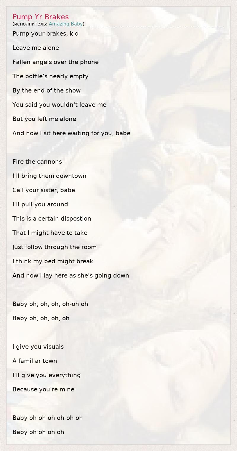Pump your brakes, kid Leave me alone Fallen angels over the phone The bottle's nearly empty By the end of the show You said you wouldn't leave me But you left me alone And now I sit here waiting for you, babe Fire the cannons I'll bring them downtown Call your sister, babe I'll pull you around This is a certain dispostion That I might have to take Just follow through the room I think my bed might break And now I lay here as she's going down Baby oh, oh, oh, oh-oh oh Baby oh, oh, oh, oh I give you visuals A familiar town I'll give you everything Because you're mine Baby oh oh oh oh-oh oh Baby oh oh oh oh