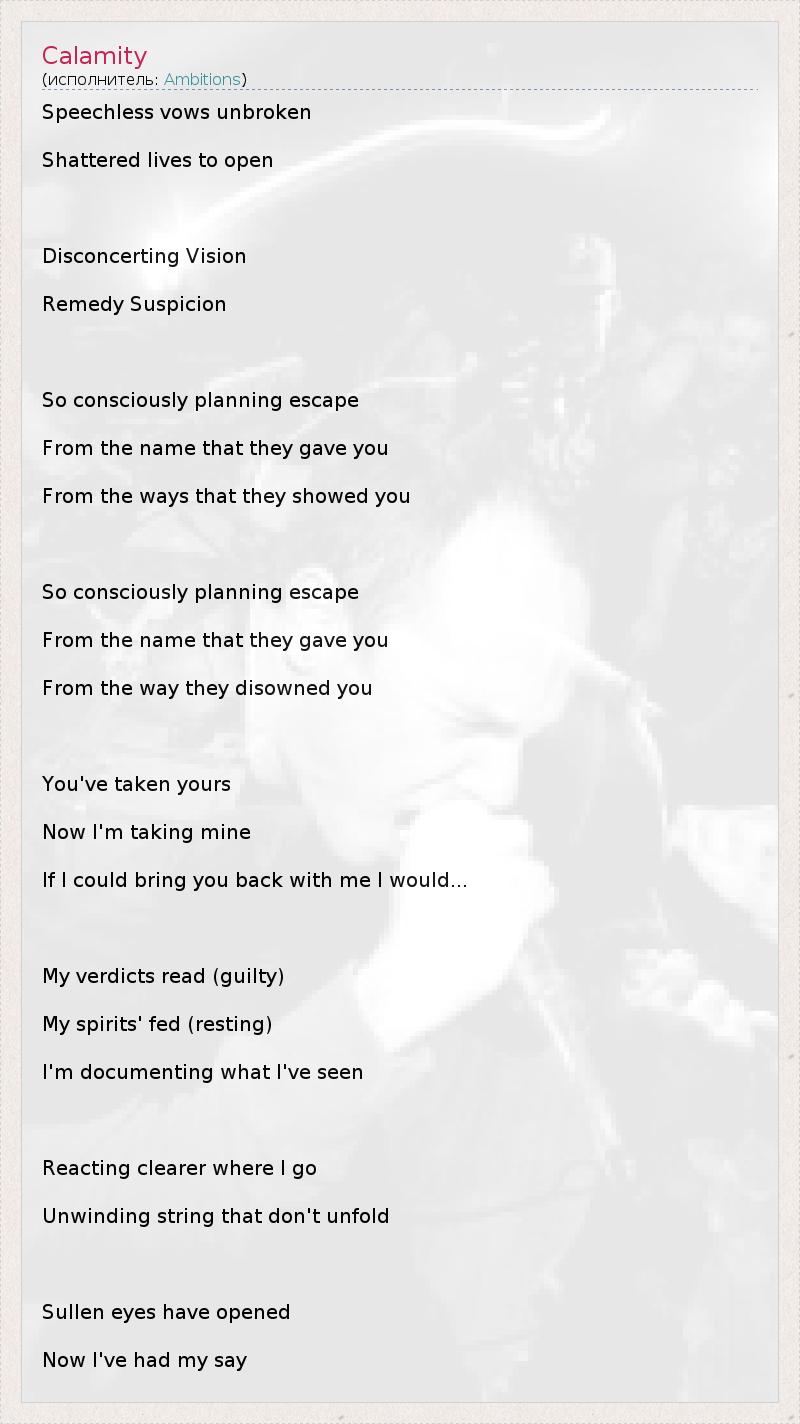 Speechless vows unbroken Shattered lives to open Disconcerting Vision Remedy Suspicion So consciously planning escape From the name that they gave you From the ways that they showed you So consciously planning escape From the name that they gave you From the way they disowned you You've taken yours Now I'm taking mine If I could bring you back with me I would... My verdicts read (guilty) My spirits' fed (resting) I'm documenting what I've seen Reacting clearer where I go Unwinding string that don't unfold Sullen eyes have opened Now I've had my say