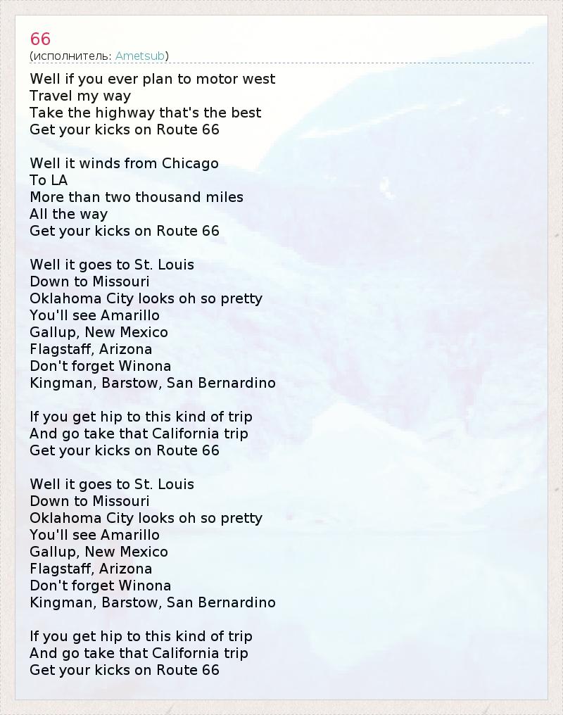 Если однажды ты вознамеришься отправиться на запад, Следуй моим путём. Езжай по лучшему шоссе, Получи кайф на Трассе 66! Она поворачивает от Чикаго В Лос-Анджелес. Весь путь - Более двух тысяч миль. Получи кайф на Трассе 66! Она ведёт в Сент-Луис, Штат Миссури. Оклахома-Сити 1 - прелестный. Ты увидишь Амарилло, 2 Галлап, штат Нью-Мексико. Флагстафф, штат Аризона. И не забудь города: Уайнона, Кингмэн, 3 Барстоу, 4 Сан-Бернандино. 5 Если ты привык к такого рода поездкам, Отправляйся в это путешествие в Калифорнию, Получи кайф на Трассе 66! Она ведёт в Сент-Луис, Штат Миссури. Оклахома-Сити - прелестный. Ты увидишь Амарилло, Галлап, штат Нью-Мексико. Флагстафф, штат Аризона. И не забудь города: Уайнона, Кингмэн, Барстоу, Сан-Бернандино. Если ты привык к такого рода поездкам, Отправляйся в это путешествие в Калифорнию, Получи кайф на Трассе 66! 1 - столица и самый большой город штата Оклахома 2 - город в штате Техас 3 - Уайнона, Кингмэн - города в штате Аризона 4 - город в штате Техас 5 - город в штате Калифорния