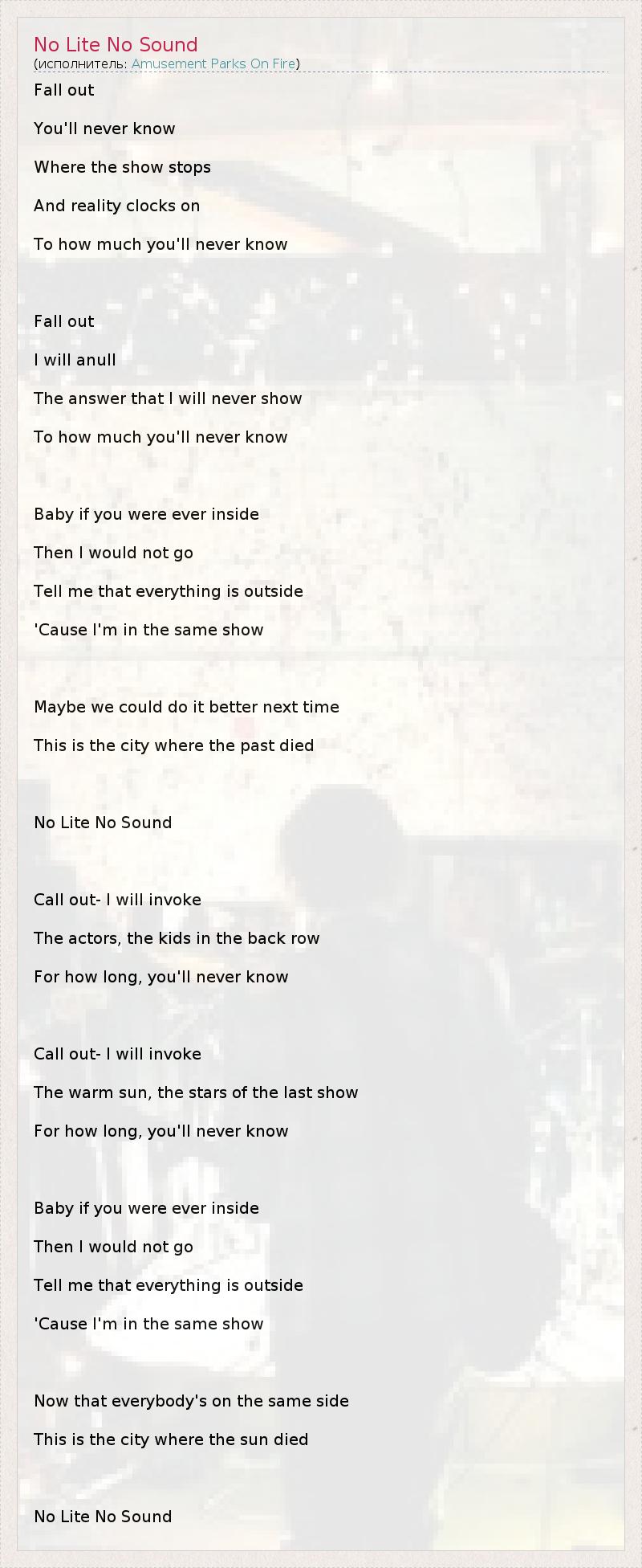 Fall out You'll never know Where the show stops And reality clocks on To how much you'll never know Fall out I will anull The answer that I will never show To how much you'll never know Baby if you were ever inside Then I would not go Tell me that everything is outside 'Cause I'm in the same show Maybe we could do it better next time This is the city where the past died No Lite No Sound Call out- I will invoke The actors, the kids in the back row For how long, you'll never know Call out- I will invoke The warm sun, the stars of the last show For how long, you'll never know Baby if you were ever inside Then I would not go Tell me that everything is outside 'Cause I'm in the same show Now that everybody's on the same side This is the city where the sun died No Lite No Sound