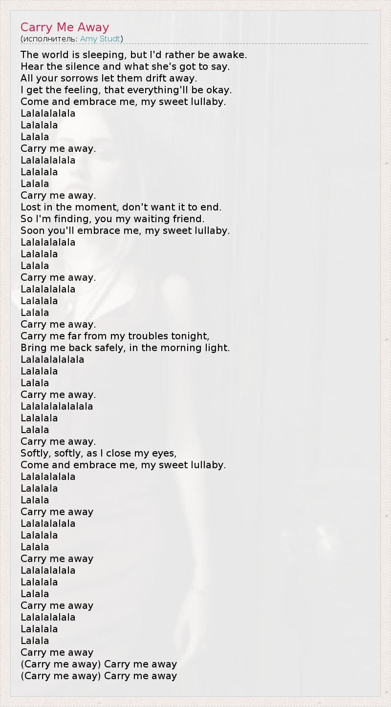 The world is sleeping, but I'd rather be awake. Hear the silence and what she's got to say. All your sorrows let them drift away. I get the feeling, that everything'll be okay. Come and embrace me, my sweet lullaby. Lalalalalala Lalalala Lalala Carry me away. Lalalalalala Lalalala Lalala Carry me away. Lost in the moment, don't want it to end. So I'm finding, you my waiting friend. Soon you'll embrace me, my sweet lullaby. Lalalalalala Lalalala Lalala Carry me away. Lalalalalala Lalalala Lalala Carry me away. Carry me far from my troubles tonight, Bring me back safely, in the morning light. Lalalalalalala Lalalala Lalala Carry me away. Lalalalalalalala Lalalala Lalala Carry me away. Softly, softly, as I close my eyes, Come and embrace me, my sweet lullaby. Lalalalalala Lalalala Lalala Carry me away Lalalalalala Lalalala Lalala Carry me away Lalalalalala Lalalala Lalala Carry me away Lalalalalala Lalalala Lalala Carry me away (Carry me away) Carry me away (Carry me away) Carry me away