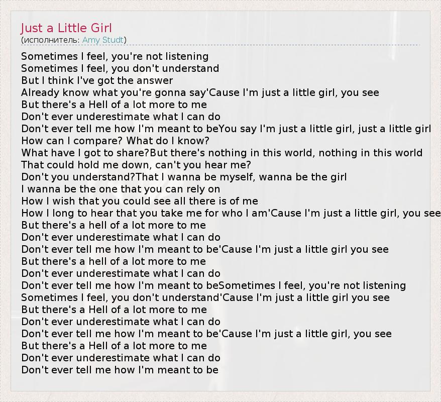 Sometimes I feel, you're not listening Sometimes I feel, you don't understand But I think I've got the answer Already know what you're gonna say'Cause I'm just a little girl, you see But there's a Hell of a lot more to me Don't ever underestimate what I can do Don't ever tell me how I'm meant to beYou say I'm just a little girl, just a little girl How can I compare? What do I know? What have I got to share?But there's nothing in this world, nothing in this world That could hold me down, can't you hear me? Don't you understand?That I wanna be myself, wanna be the girl I wanna be the one that you can rely on How I wish that you could see all there is of me How I long to hear that you take me for who I am'Cause I'm just a little girl, you see But there's a hell of a lot more to me Don't ever underestimate what I can do Don't ever tell me how I'm meant to be'Cause I'm just a little girl you see But there's a hell of a lot more to me Don't ever underestimate what I can do Don't ever tell me how I'm meant to beSometimes I feel, you're not listening Sometimes I feel, you don't understand'Cause I'm just a little girl you see But there's a Hell of a lot more to me Don't ever underestimate what I can do Don't ever tell me how I'm meant to be'Cause I'm just a little girl, you see But there's a Hell of a lot more to me Don't ever underestimate what I can do Don't ever tell me how I'm meant to be