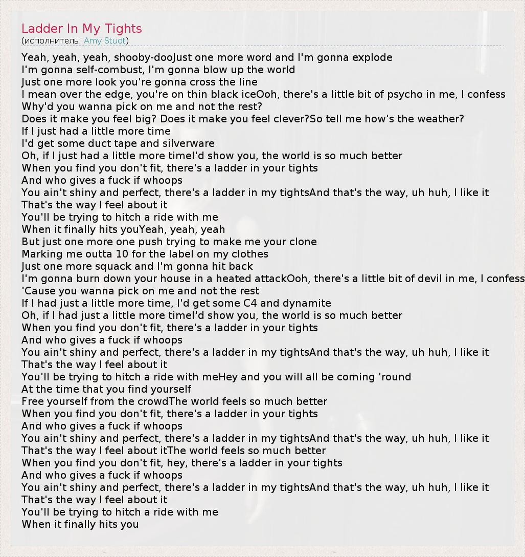 Yeah, yeah, yeah, shooby-dooJust one more word and I'm gonna explode I'm gonna self-combust, I'm gonna blow up the world Just one more look you're gonna cross the line I mean over the edge, you're on thin black iceOoh, there's a little bit of psycho in me, I confess Why'd you wanna pick on me and not the rest? Does it make you feel big? Does it make you feel clever?So tell me how's the weather? If I just had a little more time I'd get some duct tape and silverware Oh, if I just had a little more timeI'd show you, the world is so much better When you find you don't fit, there's a ladder in your tights And who gives a fuck if whoops You ain't shiny and perfect, there's a ladder in my tightsAnd that's the way, uh huh, I like it That's the way I feel about it You'll be trying to hitch a ride with me When it finally hits youYeah, yeah, yeah But just one more one push trying to make me your clone Marking me outta 10 for the label on my clothes Just one more squack and I'm gonna hit back I'm gonna burn down your house in a heated attackOoh, there's a little bit of devil in me, I confess 'Cause you wanna pick on me and not the rest If I had just a little more time, I'd get some C4 and dynamite Oh, if I had just a little more timeI'd show you, the world is so much better When you find you don't fit, there's a ladder in your tights And who gives a fuck if whoops You ain't shiny and perfect, there's a ladder in my tightsAnd that's the way, uh huh, I like it That's the way I feel about it You'll be trying to hitch a ride with meHey and you will all be coming 'round At the time that you find yourself Free yourself from the crowdThe world feels so much better When you find you don't fit, there's a ladder in your tights And who gives a fuck if whoops You ain't shiny and perfect, there's a ladder in my tightsAnd that's the way, uh huh, I like it That's the way I feel about itThe world feels so much better When you find you don't fit, hey, there's a ladder in your tights And who gives a fuck if whoops You ain't shiny and perfect, there's a ladder in my tightsAnd that's the way, uh huh, I like it That's the way I feel about it You'll be trying to hitch a ride with me When it finally hits you
