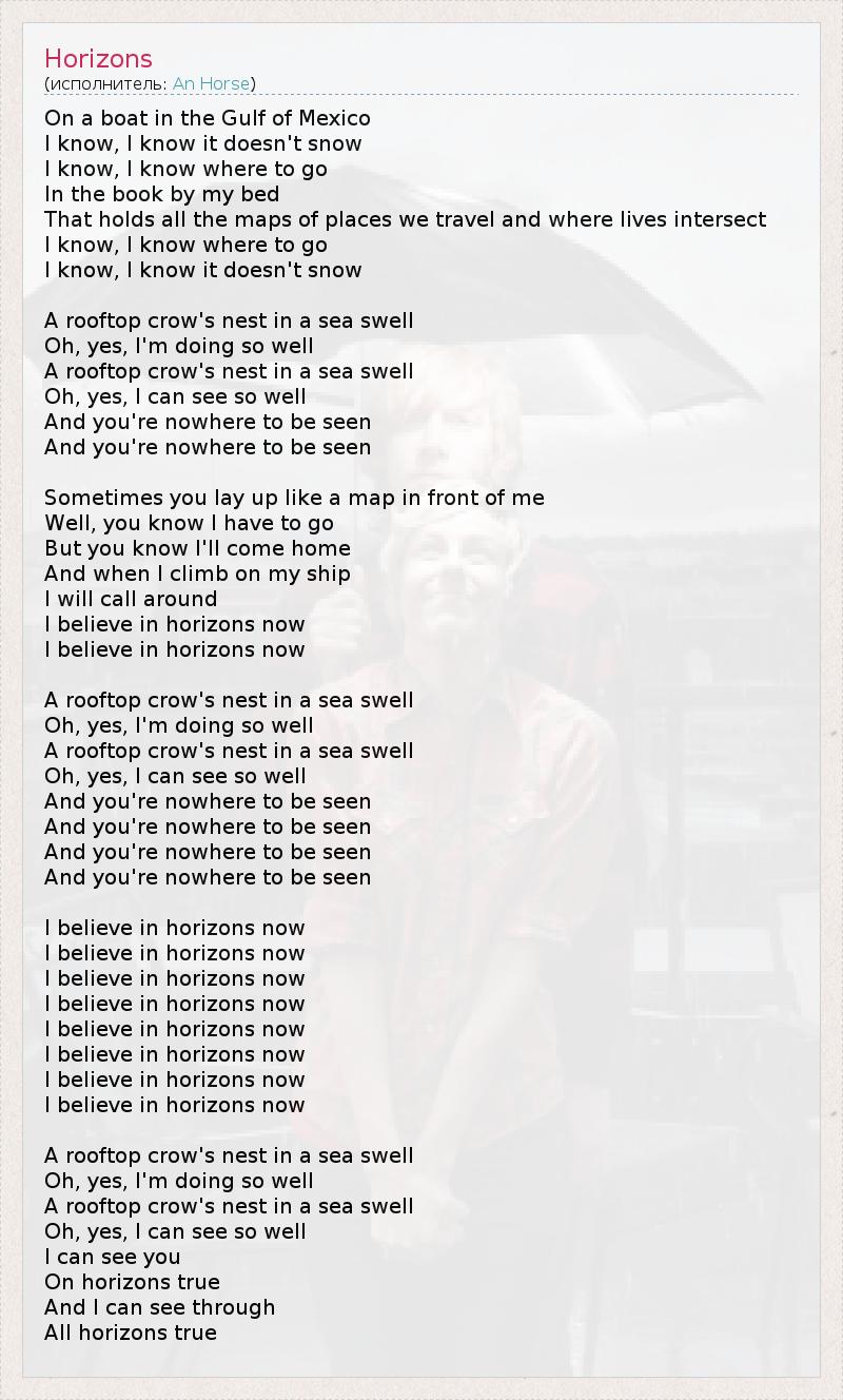 On a boat in the Gulf of Mexico I know, I know it doesn't snow I know, I know where to go In the book by my bed That holds all the maps of places we travel and where lives intersect I know, I know where to go I know, I know it doesn't snow A rooftop crow's nest in a sea swell Oh, yes, I'm doing so well A rooftop crow's nest in a sea swell Oh, yes, I can see so well And you're nowhere to be seen And you're nowhere to be seen Sometimes you lay up like a map in front of me Well, you know I have to go But you know I'll come home And when I climb on my ship I will call around I believe in horizons now I believe in horizons now A rooftop crow's nest in a sea swell Oh, yes, I'm doing so well A rooftop crow's nest in a sea swell Oh, yes, I can see so well And you're nowhere to be seen And you're nowhere to be seen And you're nowhere to be seen And you're nowhere to be seen I believe in horizons now I believe in horizons now I believe in horizons now I believe in horizons now I believe in horizons now I believe in horizons now I believe in horizons now I believe in horizons now A rooftop crow's nest in a sea swell Oh, yes, I'm doing so well A rooftop crow's nest in a sea swell Oh, yes, I can see so well I can see you On horizons true And I can see through All horizons true