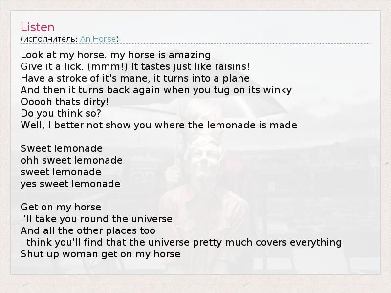 Look at my horse. my horse is amazing Give it a lick. (mmm!) It tastes just like raisins! Have a stroke of it's mane, it turns into a plane And then it turns back again when you tug on its winky Ooooh thats dirty! Do you think so? Well, I better not show you where the lemonade is made Sweet lemonade ohh sweet lemonade sweet lemonade yes sweet lemonade Get on my horse I'll take you round the universe And all the other places too I think you'll find that the universe pretty much covers everything Shut up woman get on my horse