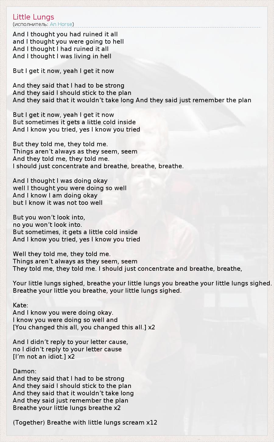 And I thought you had ruined it all and I thought you were going to hell And I thought I had ruined it all And I thought I was living in hell But I get it now, yeah I get it now And they said that I had to be strong And they said I should stick to the plan And they said that it wouldn’t take long And they said just remember the plan But I get it now, yeah I get it now But sometimes it gets a little cold inside And I know you tried, yes I know you tried But they told me, they told me. Things aren’t always as they seem, seem And they told me, they told me. I should just concentrate and breathe, breathe, breathe. And I thought I was doing okay well I thought you were doing so well And I know I am doing okay but I know it was not too well But you won’t look into, no you won’t look into. But sometimes, it gets a little cold inside And I know you tried, yes I know you tried Well they told me, they told me. Things aren’t always as they seem, seem They told me, they told me. I should just concentrate and breathe, breathe, Your little lungs sighed, breathe your little lungs you breathe your little lungs sighed. Breathe your little you breathe, your little lungs sighed. Kate: And I know you were doing okay. I know you were doing so well and [You changed this all, you changed this all.] x2 And I didn’t reply to your letter cause, no I didn’t reply to your letter cause [I’m not an idiot.] x2 Damon: And they said that I had to be strong And they said I should stick to the plan And they said that it wouldn’t take long And they said just remember the plan Breathe your little lungs breathe x2 (Together) Breathe with little lungs scream x12