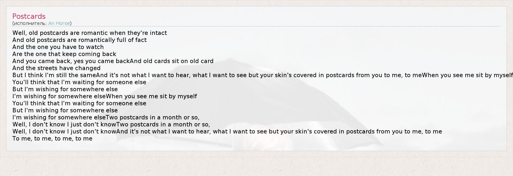 Well, old postcards are romantic when they're intact And old postcards are romantically full of fact And the one you have to watch Are the one that keep coming back And you came back, yes you came backAnd old cards sit on old card And the streets have changed But I think I'm still the sameAnd it's not what I want to hear, what I want to see but your skin's covered in postcards from you to me, to meWhen you see me sit by myself You'll think that I'm waiting for someone else But I'm wishing for somewhere else I'm wishing for somewhere elseWhen you see me sit by myself You'll think that I'm waiting for someone else But I'm wishing for somewhere else I'm wishing for somewhere elseTwo postcards in a month or so, Well, I don't know I just don't knowTwo postcards in a month or so, Well, I don't know I just don't knowAnd it's not what I want to hear, what I want to see but your skin's covered in postcards from you to me, to me To me, to me, to me, to me