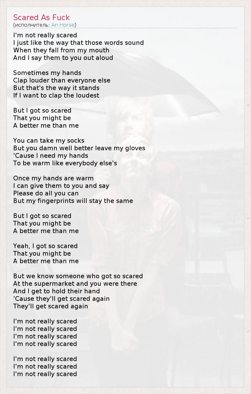 I'm not really scared I just like the way that those words sound When they fall from my mouth And I say them to you out aloud Sometimes my hands Clap louder than everyone else But that's the way it stands If I want to clap the loudest But I got so scared That you might be A better me than me You can take my socks But you damn well better leave my gloves 'Cause I need my hands To be warm like everybody else's Once my hands are warm I can give them to you and say Please do all you can But my fingerprints will stay the same But I got so scared That you might be A better me than me Yeah, I got so scared That you might be A better me than me But we know someone who got so scared At the supermarket and you were there And I get to hold their hand 'Cause they'll get scared again They'll get scared again I'm not really scared I'm not really scared I'm not really scared I'm not really scared I'm not really scared I'm not really scared I'm not really scared