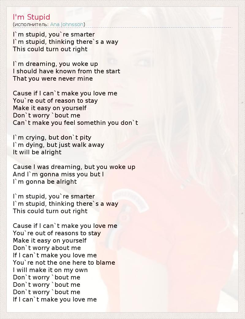 I`m stupid, you`re smarter I`m stupid, thinking there`s a way This could turn out right I`m dreaming, you woke up I should have known from the start That you were never mine Cause if I can`t make you love me You`re out of reason to stay Make it easy on yourself Don`t worry `bout me Can`t make you feel somethin you don`t I`m crying, but don`t pity I`m dying, but just walk away It will be alright Cause I was dreaming, but you woke up And I`m gonna miss you but I I`m gonna be alright I`m stupid, you`re smarter I`m stupid, thinking there`s a way This could turn out right Cause if I can`t make you love me You`re out of reasons to stay Make it easy on yourself Don`t worry about me If I can`t make you love me You`re not the one here to blame I will make it on my own Don`t worry `bout me Don`t worry `bout me Don`t worry `bout me If I can`t make you love me