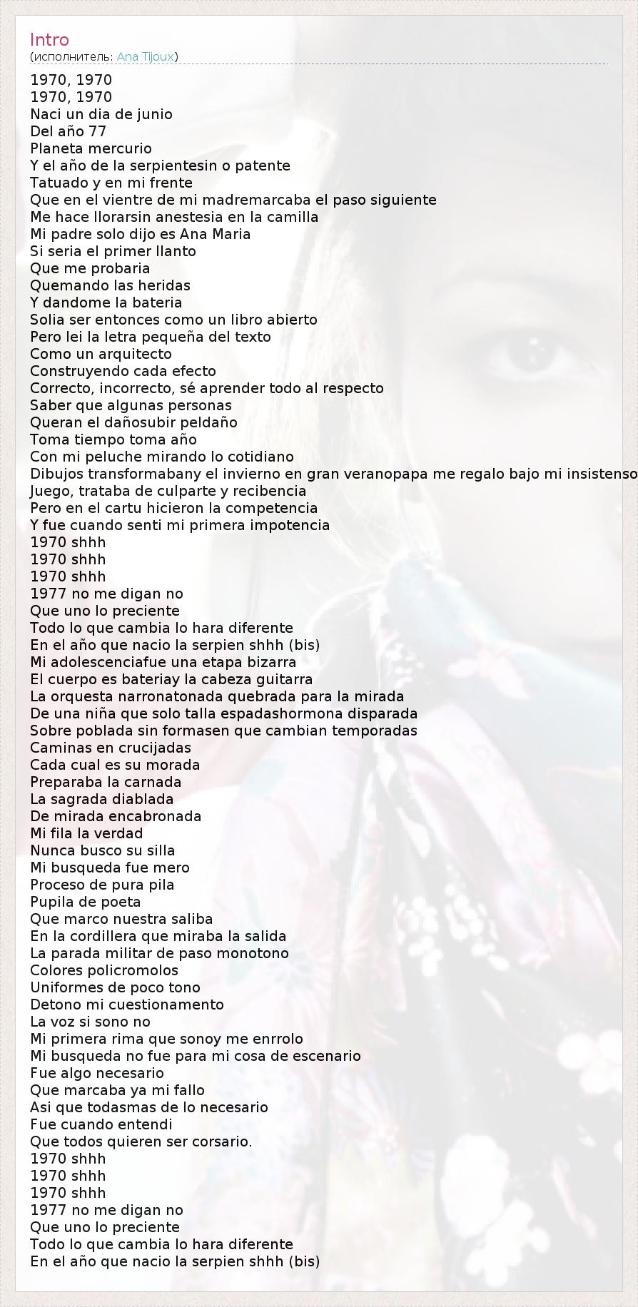 1970 , 1970 1970 , 1970 Naci ООН Диа-де- Junio Дель año 77 Планета Меркурио Y -эль año -де-ла serpientesin о Patente Tatuado у ан миль Фронт Que ан -эль vientre де миль madremarcaba Эль-Пасо siguiente Меня HACE llorarsin anestesia ан Камилла Ми падре соло Dijo эс Ana Maria Si -сериа эль грунт Llanto Que меня probaria Quemando лас heridas Y dandome Ла Батерия Солиа сер entonces Комо ООН Libro Abierto Перо леев ла Letra pequeña дель Texto Комо ООН Arquitecto Construyendo Када Efecto Correcto , incorrecto , sé Aprender TODO аль respecto Сабля Que algunas персоны Queran эль dañosubir peldaño Тома Tiempo тома año Con ми Peluche Mirando ло cotidiano DIBUJOS transformabany эль Invierno ан Гран veranopapa меня Регало Бахо миль insistenso Juego , trataba де culparte у recibencia Перо ан -эль Карту hicieron ла Competencia Y ФРУ Cuando сентов миль Primera impotencia 1970 тссс 1970 тссс 1970 тссс 1977 нет меня digan нет Que UNO вот preciente Todo вот дие Cambia вот хара Diferente En -эль año Que Nacio ла serpien тсс ( бис ) Ми adolescenciafue уна ЭТАПА bizarra Эль Cuerpo эс bateriay ла Кабеса Guitarra La Orquesta narronatonada Куебрада пункт La Mirada De Una niña Que соло Талла espadashormona disparada Sobre poblada грех formasen Que cambian temporadas Caminas ан crucijadas Када CuAL эс су Morada Preparaba ла carnada La Sagrada diablada De Mirada encabronada Ми Фила ла Verdad Nunca Busco су Силла Ми Búsqueda ФРУ меро Proceso де пура Пила Pupila де поэта Que Марко Нуэстра Салиба En ла кордильеры Que miraba ла Salida Ла Парада Militar де -Пасо monotono Colores policromolos Униформа де Poco Тоно Detono миль cuestionamento La VOZ си Соно нет Ми Primera Римма Que sonoy меня enrrolo Ми Búsqueda нет ФРУ пункт миль Cosa де escenario Fue Algo necesario Que marcaba я миль Fallo Аси Que todasmas де ло necesario Fue Cuando entendi Que Todos quieren сер Corsario . 1970 тссс 1970 тссс 1970 тссс 1977 нет меня digan нет Que UNO вот preciente Todo вот дие Cambia вот хара Diferente En -эль año Que Nacio ла serpien тсс ( бис )