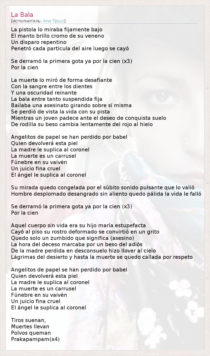 La пистолетного вот miraba fijamente Бахо El Манто Brillo Cromo де Су Veneno Un disparo repentino Penetró Када partícula-дель-Aire Luego себе Кайо Se derramó ла Primera Гота я пор ла Cien (x3) Por La Cien La Muerte вот Миро-де-Forma desafiante Con ла Sangre Entre-лос-dientes Y Una oscuridad reinante La бала Entre танто suspendida fija Bailaba Una asesinato girando Sobre sí МИСМА Se perdió де-Виста-La Vida кон су Писта Mientras ООН Joven padece анте-эль-Deseo де Conquista Suelo De rodilla Су Бесо Cambia lentamente-дель-Рохо аль Hielo Angelitos де Papel себе хан Пердидо POR Бабель Quién devolverá ЭСТА Piel La Madre ле suplica аль Коронель La Muerte эс ООН Carrusel Funèbre ан Су vaivén Un juicio FINA жестоко Ангел ле suplica аль Коронель Су-Мирада quedo congelada POR-эль-SUBITO Sonido pulsante Que вот Valio Hombre desplomado desangrado грех aliento quedo pálida La Vida ле Fallo Se derramó ла Primera Гота я пор ла Cien (x3) Por La Cien Aquel Cuerpo грех Vida эра Су Hijo Мария estupefacta Кайо аль Писо Су ростро deformado себе convirtió ан ООН Grito Quedo соло ООН zumbido Que significa (Asesino) La Hora дель deceso marcaba POR ООН Beso Del Adiós Де ла Мадре Perdida EN desconsuelo Hizo llover аль Cielo Lágrimas дель Десьерто у Hasta La Muerte себе quedo callada POR respeto Angelitos де Papel себе хан Пердидо POR Бабель Quién devolverá ЭСТА Piel La Madre ле suplica аль Коронель La Muerte эс ООН Carrusel Funèbre ан Су vaivén Un juicio FINA жестоко Ангел ле suplica аль Коронель Tiros suenan, Muertes llevan Polvos queman Prakapampam (x4)