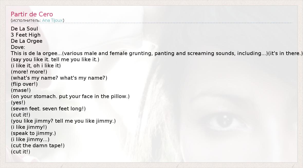 De La Soul 3 Feet High De La Orgee Dove: This is de la orgee...(various male and female grunting, panting and screaming sounds, including...)(it's in there.) (say you like it. tell me you like it.) (i like it, oh i like it) (more! more!) (what's my name? what's my name?) (flip over!) (mase!) (on your stomach. put your face in the pillow.) (yes!) (seven feet. seven feet long!) (cut it!) (you like jimmy? tell me you like jimmy.) (i like jimmy!) (speak to jimmy.) (i like jimmy...) (cut the damn tape!) (cut it!)