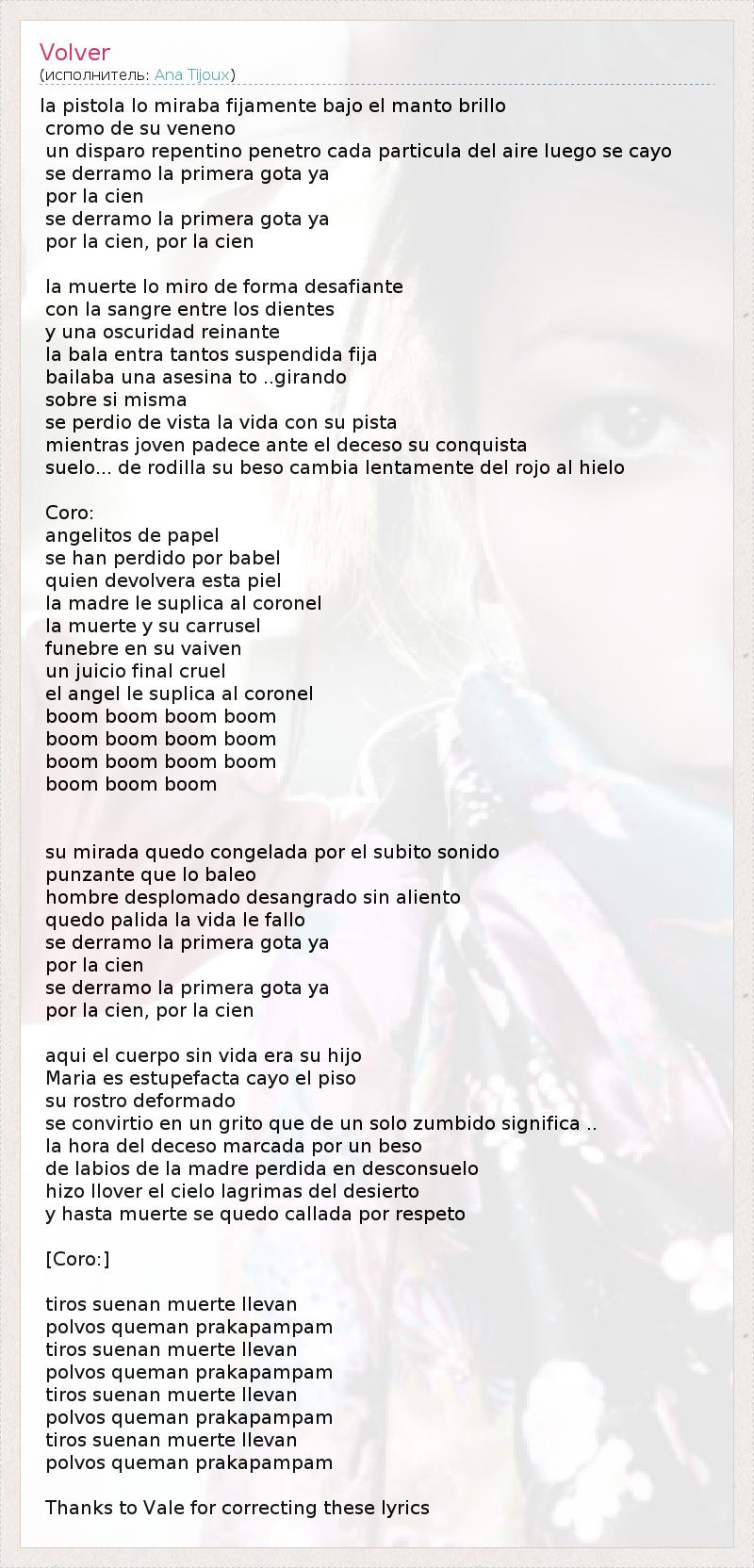 la pistola lo miraba fijamente bajo el manto brillo cromo de su veneno un disparo repentino penetro cada particula del aire luego se cayo se derramo la primera gota ya por la cien se derramo la primera gota ya por la cien, por la cien la muerte lo miro de forma desafiante con la sangre entre los dientes y una oscuridad reinante la bala entra tantos suspendida fija bailaba una asesina to ..girando sobre si misma se perdio de vista la vida con su pista mientras joven padece ante el deceso su conquista suelo... de rodilla su beso cambia lentamente del rojo al hielo Coro: angelitos de papel se han perdido por babel quien devolvera esta piel la madre le suplica al coronel la muerte y su carrusel funebre en su vaiven un juicio final cruel el angel le suplica al coronel boom boom boom boom boom boom boom boom boom boom boom boom boom boom boom su mirada quedo congelada por el subito sonido punzante que lo baleo hombre desplomado desangrado sin aliento quedo palida la vida le fallo se derramo la primera gota ya por la cien se derramo la primera gota ya por la cien, por la cien aqui el cuerpo sin vida era su hijo Maria es estupefacta cayo el piso su rostro deformado se convirtio en un grito que de un solo zumbido significa .. la hora del deceso marcada por un beso de labios de la madre perdida en desconsuelo hizo llover el cielo lagrimas del desierto y hasta muerte se quedo callada por respeto [Coro:] tiros suenan muerte llevan polvos queman prakapampam tiros suenan muerte llevan polvos queman prakapampam tiros suenan muerte llevan polvos queman prakapampam tiros suenan muerte llevan polvos queman prakapampam Thanks to Vale for correcting these lyrics