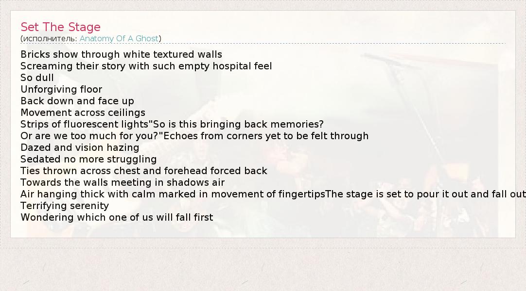 Это интересно:Команда сформировалась в 2002 году. Портленд, штат Орегон. В течении месяца парни уже подписали контракт с Rise Records. Летом 2003 Anatomy Of A Ghost отправились в турне национального масштаба с Saosin и Boys Night Out, выпуская свой дебютный альбом "Evanesce", который был записан в октябре.Группа распалась в мае 2004 года, из-за сильной критики. К началу 2005 у Anatomy of a Ghost появились силы и они решили записать второй... продолжение