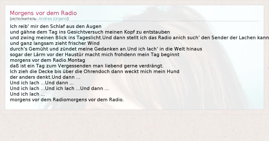 Ich reib' mir den Schlaf aus den Augen und gähne dem Tag ins Gesichtversuch meinen Kopf zu entstauben und zwing meinen Blick ins Tageslicht.Und dann stellt ich das Radio anich such' den Sender der Lachen kann und ganz langsam zieht frischer Wind durch's Gemüht und zündet meine Gedanken an.Und ich lach' in die Welt hinaus sogar der Lärm vor der Haustür macht mich frohdenn mein Tag beginnt morgens vor dem Radio.Montag daß ist ein Tag zum Vergessenden man liebend gerne verdrängt. Ich zieh die Decke bis über die Ohrendoch dann weckt mich mein Hund der anders denkt.Und dann ... Und ich lach ...Und dann ... Und ich lach ...Und ich lach ...Und dann ... Und ich lach ... morgens vor dem Radiomorgens vor dem Radio.