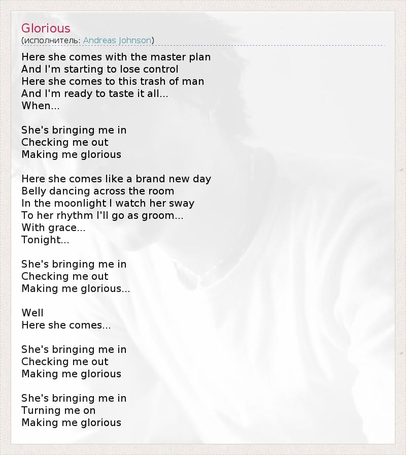 Here she comes with the master plan And I'm starting to lose control Here she comes to this trash of man And I'm ready to taste it all... When... She's bringing me in Checking me out Making me glorious Here she comes like a brand new day Belly dancing across the room In the moonlight I watch her sway To her rhythm I'll go as groom... With grace... Tonight... She's bringing me in Checking me out Making me glorious... Well Here she comes... She's bringing me in Checking me out Making me glorious She's bringing me in Turning me on Making me glorious