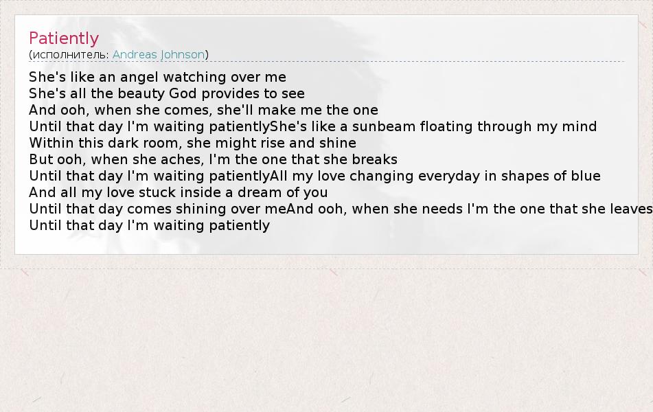 She's like an angel watching over me She's all the beauty God provides to see And ooh, when she comes, she'll make me the one Until that day I'm waiting patientlyShe's like a sunbeam floating through my mind Within this dark room, she might rise and shine But ooh, when she aches, I'm the one that she breaks Until that day I'm waiting patientlyAll my love changing everyday in shapes of blue And all my love stuck inside a dream of you Until that day comes shining over meAnd ooh, when she needs I'm the one that she leaves Until that day I'm waiting patiently