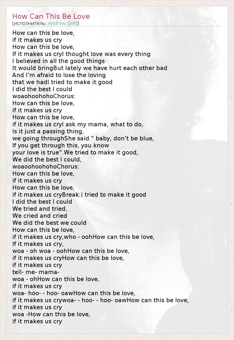 How can this be love, if it makes us cry How can this be love, If it makes us cryI thought love was every thing I believed in all the good things It would bringBut lately we have hurt each other bad And I'm afraid to lose the loving that we hadI tried to make it good I did the best I could woaohoohohoChorus: How can this be love, if it makes us cry How can this be love, if it makes us cryI ask my mama, what to do, Is it just a passing thing, we going throughShe said " baby, don't be blue, If you get through this, you know your love is true".We tried to make it good, We did the best I could, woaoohoohohoChorus: How can this be love, if it makes us cry How can this be love, if it makes us cryBreak:I tried to make it good I did the best I could We tried and tried, We cried and cried We did the best we could How can this be love, if it makes us cry,who - oohHow can this be love, If it makes us cry, woa - oh woa - oohHow can this be love, if it makes us cryHow can this be love, if it makes us cry tell- me- mama- woa - ohHow can this be love, if it makes us cry woa- hoo- - hoo- oawHow can this be love, if it makes us crywoa- - hoo- - hoo- oawHow can this be love, if it makes us cry woa -How can this be love, if it makes us cry