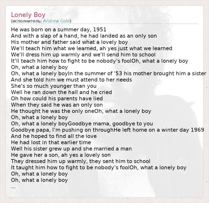 He was born on a summer day, 1951 And with a slap of a hand, he had landed as an only son His mother and father said what a lovely boy We'll teach him what we learned, ah yes just what we learned We'll dress him up warmly and we'll send him to school It'll teach him how to fight to be nobody's foolOh, what a lonely boy Oh, what a lonely boy Oh, what a lonely boyIn the summer of '53 his mother brought him a sister And she told him we must attend to her needs She's so much younger than you Well he ran down the hall and he cried Oh how could his parents have lied When they said he was an only son He thought he was the only oneOh, what a lonely boy Oh, what a lonely boy Oh, what a lonely boyGoodbye mama, goodbye to you Goodbye papa, I'm pushing on throughHe left home on a winter day 1969 And he hoped to find all the love He had lost in that earlier time Well his sister grew up and she married a man He gave her a son, ah yes a lovely son They dressed him up warmly, they sent him to school It taught him how to fight to be nobody's foolOh, what a lonely boy Oh, what a lonely boy Oh, what a lonely boy ...