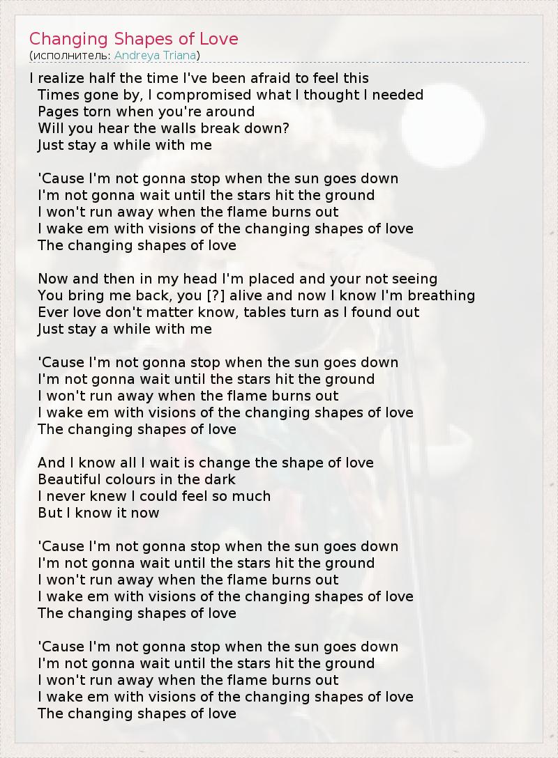 I realize half the time I've been afraid to feel this Times gone by, I compromised what I thought I needed Pages torn when you're around Will you hear the walls break down? Just stay a while with me 'Cause I'm not gonna stop when the sun goes down I'm not gonna wait until the stars hit the ground I won't run away when the flame burns out I wake em with visions of the changing shapes of love The changing shapes of love Now and then in my head I'm placed and your not seeing You bring me back, you [?] alive and now I know I'm breathing Ever love don't matter know, tables turn as I found out Just stay a while with me 'Cause I'm not gonna stop when the sun goes down I'm not gonna wait until the stars hit the ground I won't run away when the flame burns out I wake em with visions of the changing shapes of love The changing shapes of love And I know all I wait is change the shape of love Beautiful colours in the dark I never knew I could feel so much But I know it now 'Cause I'm not gonna stop when the sun goes down I'm not gonna wait until the stars hit the ground I won't run away when the flame burns out I wake em with visions of the changing shapes of love The changing shapes of love 'Cause I'm not gonna stop when the sun goes down I'm not gonna wait until the stars hit the ground I won't run away when the flame burns out I wake em with visions of the changing shapes of love The changing shapes of love