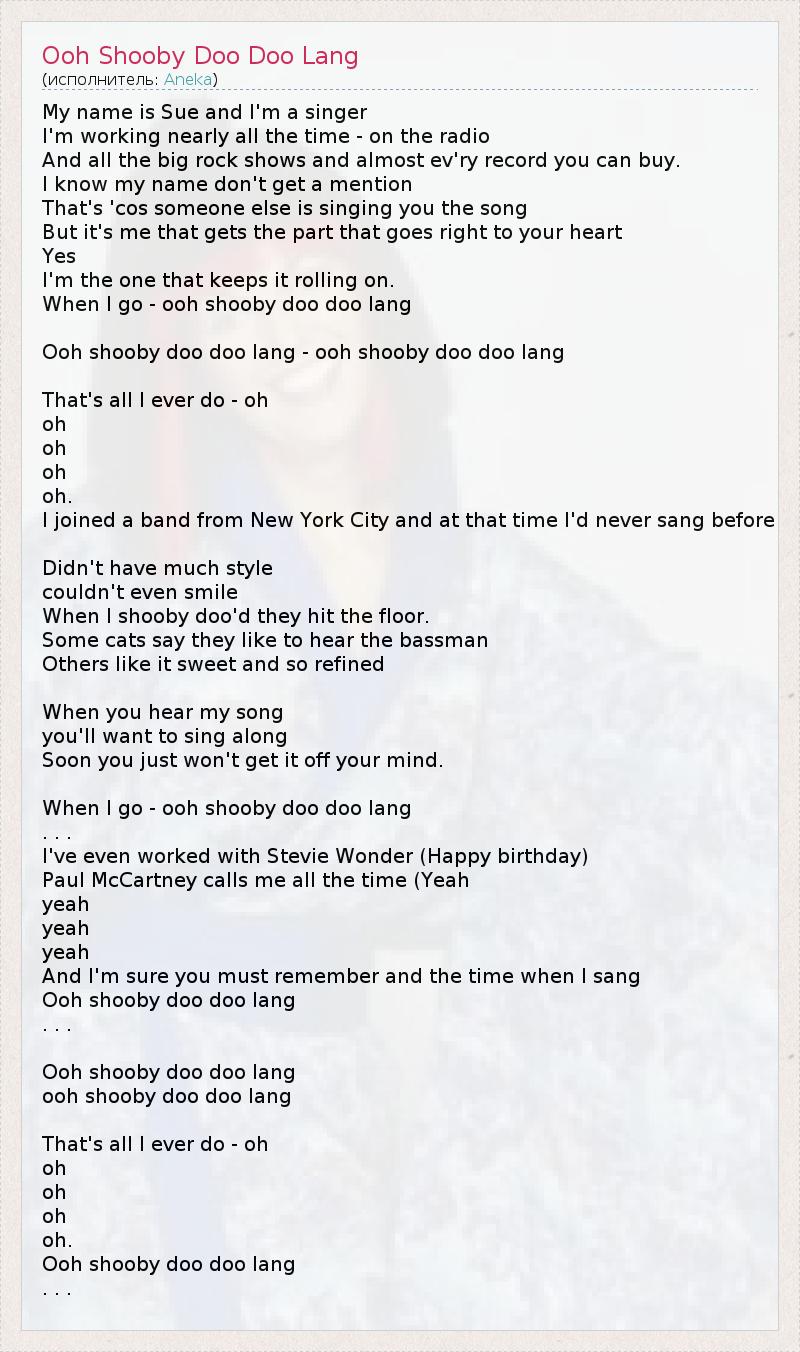 My name is Sue and I'm a singer I'm working nearly all the time - on the radio And all the big rock shows and almost ev'ry record you can buy. I know my name don't get a mention That's 'cos someone else is singing you the song But it's me that gets the part that goes right to your heart Yes I'm the one that keeps it rolling on. When I go - ooh shooby doo doo lang Ooh shooby doo doo lang - ooh shooby doo doo lang That's all I ever do - oh oh oh oh oh. I joined a band from New York City and at that time I'd never sang before Didn't have much style couldn't even smile When I shooby doo'd they hit the floor. Some cats say they like to hear the bassman Others like it sweet and so refined When you hear my song you'll want to sing along Soon you just won't get it off your mind. When I go - ooh shooby doo doo lang . . . I've even worked with Stevie Wonder (Happy birthday) Paul McCartney calls me all the time (Yeah yeah yeah yeah And I'm sure you must remember and the time when I sang Ooh shooby doo doo lang . . . Ooh shooby doo doo lang ooh shooby doo doo lang That's all I ever do - oh oh oh oh oh. Ooh shooby doo doo lang . . .