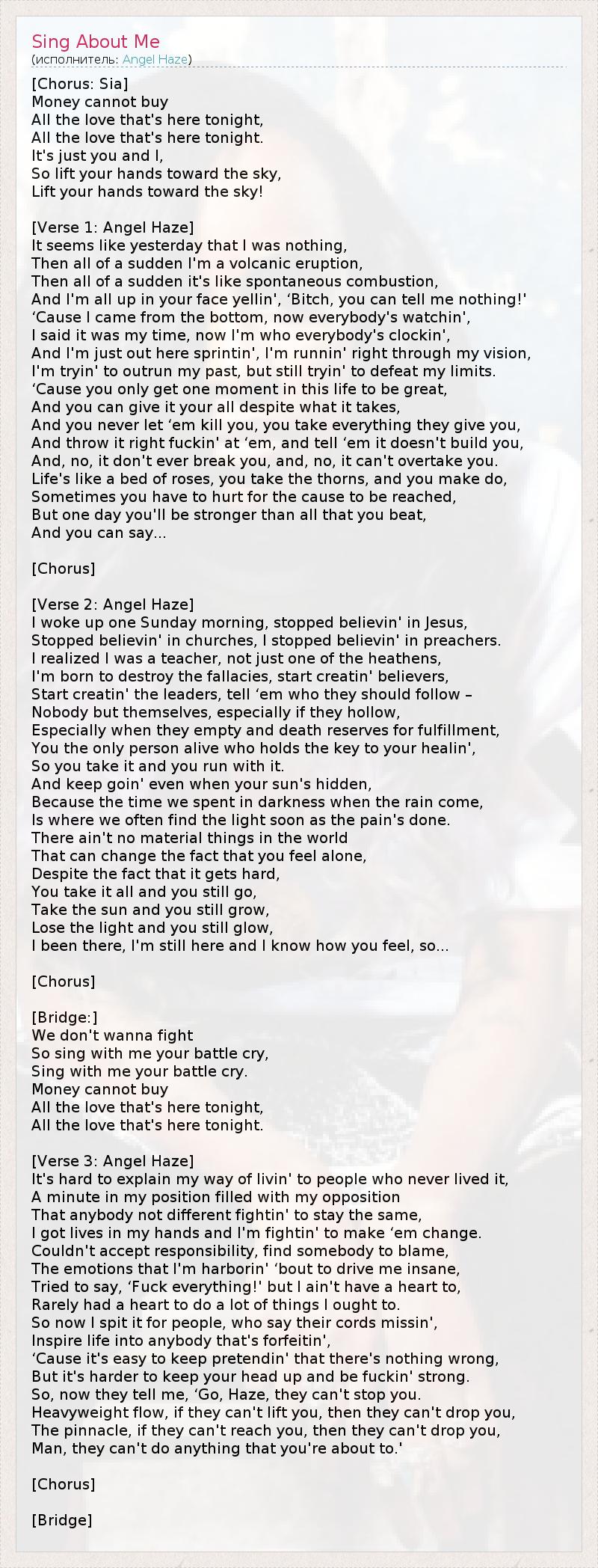 [Chorus: Sia] Money cannot buy All the love that's here tonight, All the love that's here tonight. It's just you and I, So lift your hands toward the sky, Lift your hands toward the sky! [Verse 1: Angel Haze] It seems like yesterday that I was nothing, Then all of a sudden I'm a volcanic eruption, Then all of a sudden it's like spontaneous combustion, And I'm all up in your face yellin', ‘Bitch, you can tell me nothing!' ‘Cause I came from the bottom, now everybody's watchin', I said it was my time, now I'm who everybody's clockin', And I'm just out here sprintin', I'm runnin' right through my vision, I'm tryin' to outrun my past, but still tryin' to defeat my limits. ‘Cause you only get one moment in this life to be great, And you can give it your all despite what it takes, And you never let ‘em kill you, you take everything they give you, And throw it right fuckin' at ‘em, and tell ‘em it doesn't build you, And, no, it don't ever break you, and, no, it can't overtake you. Life's like a bed of roses, you take the thorns, and you make do, Sometimes you have to hurt for the cause to be reached, But one day you'll be stronger than all that you beat, And you can say... [Chorus] [Verse 2: Angel Haze] I woke up one Sunday morning, stopped believin' in Jesus, Stopped believin' in churches, I stopped believin' in preachers. I realized I was a teacher, not just one of the heathens, I'm born to destroy the fallacies, start creatin' believers, Start creatin' the leaders, tell ‘em who they should follow – Nobody but themselves, especially if they hollow, Especially when they empty and death reserves for fulfillment, You the only person alive who holds the key to your healin', So you take it and you run with it. And keep goin' even when your sun's hidden, Because the time we spent in darkness when the rain come, Is where we often find the light soon as the pain's done. There ain't no material things in the world That can change the fact that you feel alone, Despite the fact that it gets hard, You take it all and you still go, Take the sun and you still grow, Lose the light and you still glow, I been there, I'm still here and I know how you feel, so... [Chorus] [Bridge:] We don't wanna fight So sing with me your battle cry, Sing with me your battle cry. Money cannot buy All the love that's here tonight, All the love that's here tonight. [Verse 3: Angel Haze] It's hard to explain my way of livin' to people who never lived it, A minute in my position filled with my opposition That anybody not different fightin' to stay the same, I got lives in my hands and I'm fightin' to make ‘em change. Couldn't accept responsibility, find somebody to blame, The emotions that I'm harborin' ‘bout to drive me insane, Tried to say, ‘Fuck everything!' but I ain't have a heart to, Rarely had a heart to do a lot of things I ought to. So now I spit it for people, who say their cords missin', Inspire life into anybody that's forfeitin', ‘Cause it's easy to keep pretendin' that there's nothing wrong, But it's harder to keep your head up and be fuckin' strong. So, now they tell me, ‘Go, Haze, they can't stop you. Heavyweight flow, if they can't lift you, then they can't drop you, The pinnacle, if they can't reach you, then they can't drop you, Man, they can't do anything that you're about to.' [Chorus] [Bridge]
