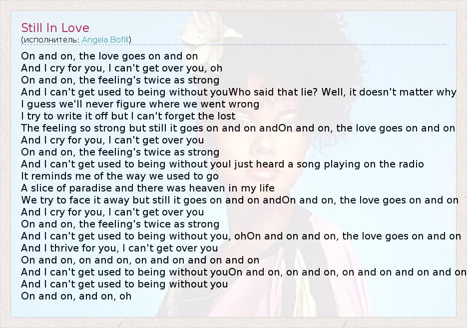 On and on, the love goes on and on And I cry for you, I can't get over you, oh On and on, the feeling's twice as strong And I can't get used to being without youWho said that lie? Well, it doesn't matter why I guess we'll never figure where we went wrong I try to write it off but I can't forget the lost The feeling so strong but still it goes on and on andOn and on, the love goes on and on And I cry for you, I can't get over you On and on, the feeling's twice as strong And I can't get used to being without youI just heard a song playing on the radio It reminds me of the way we used to go A slice of paradise and there was heaven in my life We try to face it away but still it goes on and on andOn and on, the love goes on and on And I cry for you, I can't get over you On and on, the feeling's twice as strong And I can't get used to being without you, ohOn and on and on, the love goes on and on And I thrive for you, I can't get over you On and on, on and on, on and on and on and on And I can't get used to being without youOn and on, on and on, on and on and on and on And I can't get used to being without you On and on, and on, oh