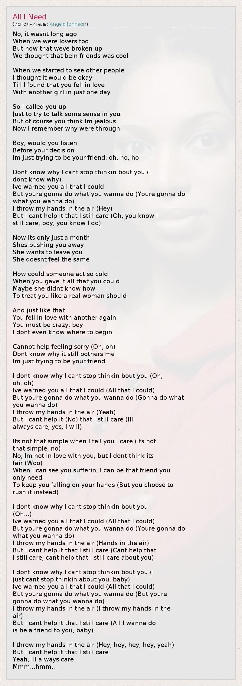 No, it wasnt long ago When we were lovers too But now that weve broken up We thought that bein friends was cool When we started to see other people I thought it would be okay Till I found that you fell in love With another girl in just one day So I called you up Just to try to talk some sense in you But of course you think Im jealous Now I remember why were through Boy, would you listen Before your decision Im just trying to be your friend, oh, ho, ho Dont know why I cant stop thinkin bout you (I dont know why) Ive warned you all that I could But youre gonna do what you wanna do (Youre gonna do what you wanna do) I throw my hands in the air (Hey) But I cant help it that I still care (Oh, you know I still care, boy, you know I do) Now its only just a month Shes pushing you away She wants to leave you She doesnt feel the same How could someone act so cold When you gave it all that you could Maybe she didnt know how To treat you like a real woman should And just like that You fell in love with another again You must be crazy, boy I dont even know where to begin Cannot help feeling sorry (Oh, oh) Dont know why it still bothers me Im just trying to be your friend I dont know why I cant stop thinkin bout you (Oh, oh, oh) Ive warned you all that I could (All that I could) But youre gonna do what you wanna do (Gonna do what you wanna do) I throw my hands in the air (Yeah) But I cant help it (No) that I still care (Ill always care, yes, I will) Its not that simple when I tell you I care (Its not that simple, no) No, Im not in love with you, but I dont think its fair (Woo) When I can see you sufferin, I can be that friend you only need To keep you falling on your hands (But you choose to rush it instead) I dont know why I cant stop thinkin bout you (Oh...) Ive warned you all that I could (All that I could) But youre gonna do what you wanna do (Youre gonna do what you wanna do) I throw my hands in the air (Hands in the air) But I cant help it that I still care (Cant help that I still care, cant help that I still care about you) I dont know why I cant stop thinkin bout you (I just cant stop thinkin about you, baby) Ive warned you all that I could (All that I could) But youre gonna do what you wanna do (But youre gonna do what you wanna do) I throw my hands in the air (I throw my hands in the air) But I cant help it that I still care (All I wanna do is be a friend to you, baby) I throw my hands in the air (Hey, hey, hey, hey, yeah) But I cant help it that I still care Yeah, Ill always care Mmm...hmm...