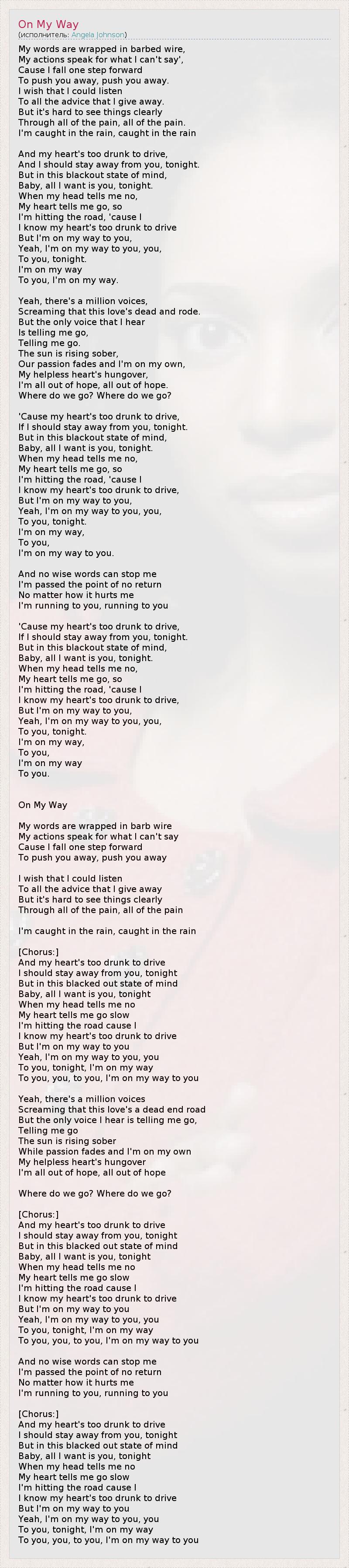 My words are wrapped in barbed wire, My actions speak for what I can't say', Cause I fall one step forward To push you away, push you away. I wish that I could listen To all the advice that I give away. But it's hard to see things clearly Through all of the pain, all of the pain. I'm caught in the rain, caught in the rain And my heart's too drunk to drive, And I should stay away from you, tonight. But in this blackout state of mind, Baby, all I want is you, tonight. When my head tells me no, My heart tells me go, so I'm hitting the road, 'cause I I know my heart's too drunk to drive But I'm on my way to you, Yeah, I'm on my way to you, you, To you, tonight. I'm on my way To you, I'm on my way. Yeah, there's a million voices, Screaming that this love's dead and rode. But the only voice that I hear Is telling me go, Telling me go. The sun is rising sober, Our passion fades and I'm on my own, My helpless heart's hungover, I'm all out of hope, all out of hope. Where do we go? Where do we go? 'Cause my heart's too drunk to drive, If I should stay away from you, tonight. But in this blackout state of mind, Baby, all I want is you, tonight. When my head tells me no, My heart tells me go, so I'm hitting the road, 'cause I I know my heart's too drunk to drive, But I'm on my way to you, Yeah, I'm on my way to you, you, To you, tonight. I'm on my way, To you, I'm on my way to you. And no wise words can stop me I'm passed the point of no return No matter how it hurts me I'm running to you, running to you 'Cause my heart's too drunk to drive, If I should stay away from you, tonight. But in this blackout state of mind, Baby, all I want is you, tonight. When my head tells me no, My heart tells me go, so I'm hitting the road, 'cause I I know my heart's too drunk to drive, But I'm on my way to you, Yeah, I'm on my way to you, you, To you, tonight. I'm on my way, To you, I'm on my way To you. On My Way My words are wrapped in barb wire My actions speak for what I can't say Cause I fall one step forward To push you away, push you away I wish that I could listen To all the advice that I give away But it's hard to see things clearly Through all of the pain, all of the pain I'm caught in the rain, caught in the rain [Chorus:] And my heart's too drunk to drive I should stay away from you, tonight But in this blacked out state of mind Baby, all I want is you, tonight When my head tells me no My heart tells me go slow I'm hitting the road cause I I know my heart's too drunk to drive But I'm on my way to you Yeah, I'm on my way to you, you To you, tonight, I'm on my way To you, you, to you, I'm on my way to you Yeah, there's a million voices Screaming that this love's a dead end road But the only voice I hear is telling me go, Telling me go The sun is rising sober While passion fades and I'm on my own My helpless heart's hungover I'm all out of hope, all out of hope Where do we go? Where do we go? [Chorus:] And my heart's too drunk to drive I should stay away from you, tonight But in this blacked out state of mind Baby, all I want is you, tonight When my head tells me no My heart tells me go slow I'm hitting the road cause I I know my heart's too drunk to drive But I'm on my way to you Yeah, I'm on my way to you, you To you, tonight, I'm on my way To you, you, to you, I'm on my way to you And no wise words can stop me I'm passed the point of no return No matter how it hurts me I'm running to you, running to you [Chorus:] And my heart's too drunk to drive I should stay away from you, tonight But in this blacked out state of mind Baby, all I want is you, tonight When my head tells me no My heart tells me go slow I'm hitting the road cause I I know my heart's too drunk to drive But I'm on my way to you Yeah, I'm on my way to you, you To you, tonight, I'm on my way To you, you, to you, I'm on my way to you