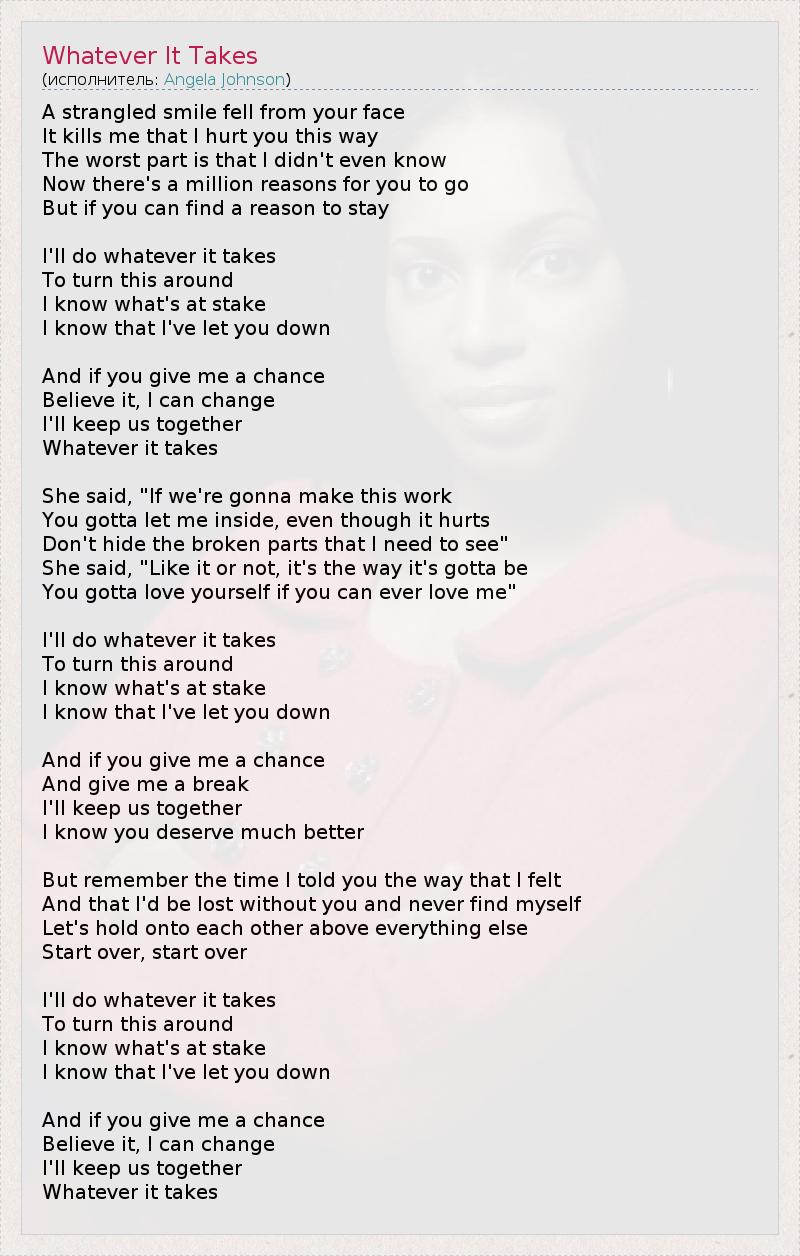 A strangled smile fell from your face It kills me that I hurt you this way The worst part is that I didn't even know Now there's a million reasons for you to go But if you can find a reason to stay I'll do whatever it takes To turn this around I know what's at stake I know that I've let you down And if you give me a chance Believe it, I can change I'll keep us together Whatever it takes She said, "If we're gonna make this work You gotta let me inside, even though it hurts Don't hide the broken parts that I need to see" She said, "Like it or not, it's the way it's gotta be You gotta love yourself if you can ever love me" I'll do whatever it takes To turn this around I know what's at stake I know that I've let you down And if you give me a chance And give me a break I'll keep us together I know you deserve much better But remember the time I told you the way that I felt And that I'd be lost without you and never find myself Let's hold onto each other above everything else Start over, start over I'll do whatever it takes To turn this around I know what's at stake I know that I've let you down And if you give me a chance Believe it, I can change I'll keep us together Whatever it takes