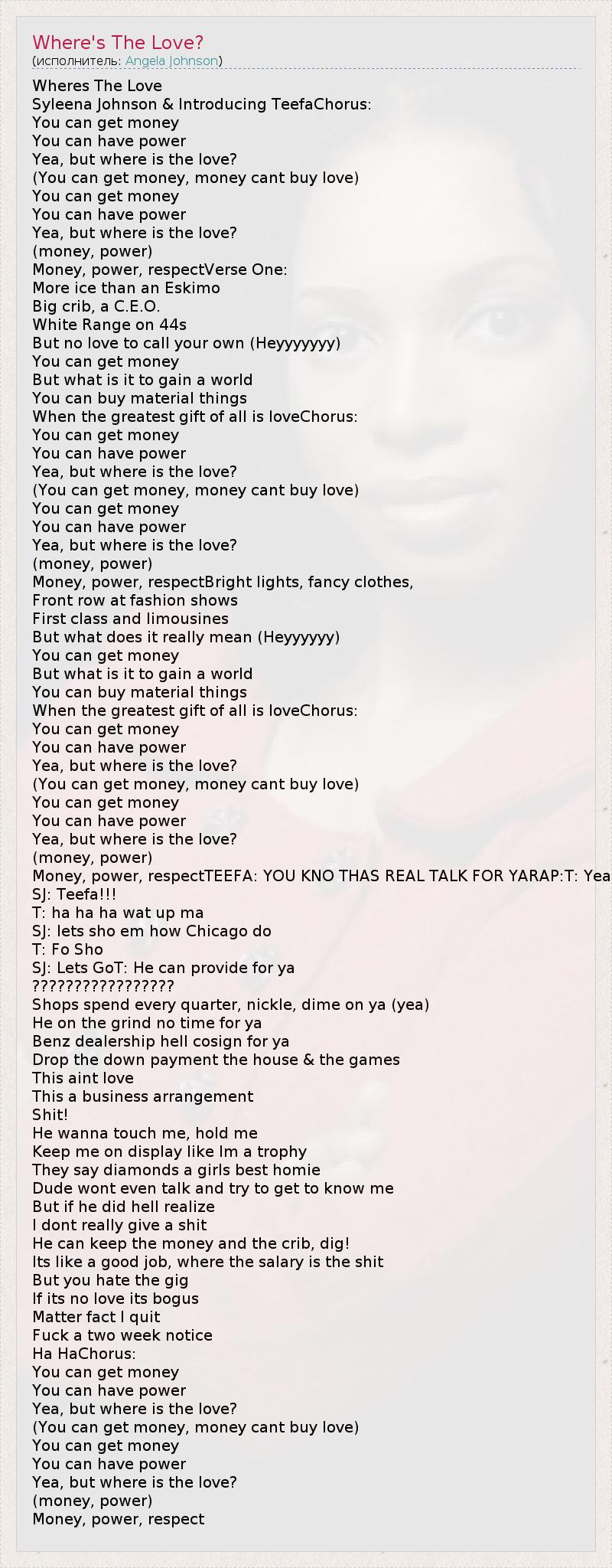 Wheres The Love Syleena Johnson & Introducing TeefaChorus: You can get money You can have power Yea, but where is the love? (You can get money, money cant buy love) You can get money You can have power Yea, but where is the love? (money, power) Money, power, respectVerse One: More ice than an Eskimo Big crib, a C.E.O. White Range on 44s But no love to call your own (Heyyyyyyy) You can get money But what is it to gain a world You can buy material things When the greatest gift of all is loveChorus: You can get money You can have power Yea, but where is the love? (You can get money, money cant buy love) You can get money You can have power Yea, but where is the love? (money, power) Money, power, respectBright lights, fancy clothes, Front row at fashion shows First class and limousines But what does it really mean (Heyyyyyy) You can get money But what is it to gain a world You can buy material things When the greatest gift of all is loveChorus: You can get money You can have power Yea, but where is the love? (You can get money, money cant buy love) You can get money You can have power Yea, but where is the love? (money, power) Money, power, respectTEEFA: YOU KNO THAS REAL TALK FOR YARAP:T: Yea SJ: Teefa!!! T: ha ha ha wat up ma SJ: lets sho em how Chicago do T: Fo Sho SJ: Lets GoT: He can provide for ya ????????????????? Shops spend every quarter, nickle, dime on ya (yea) He on the grind no time for ya Benz dealership hell cosign for ya Drop the down payment the house & the games This aint love This a business arrangement Shit! He wanna touch me, hold me Keep me on display like Im a trophy They say diamonds a girls best homie Dude wont even talk and try to get to know me But if he did hell realize I dont really give a shit He can keep the money and the crib, dig! Its like a good job, where the salary is the shit But you hate the gig If its no love its bogus Matter fact I quit Fuck a two week notice Ha HaChorus: You can get money You can have power Yea, but where is the love? (You can get money, money cant buy love) You can get money You can have power Yea, but where is the love? (money, power) Money, power, respect