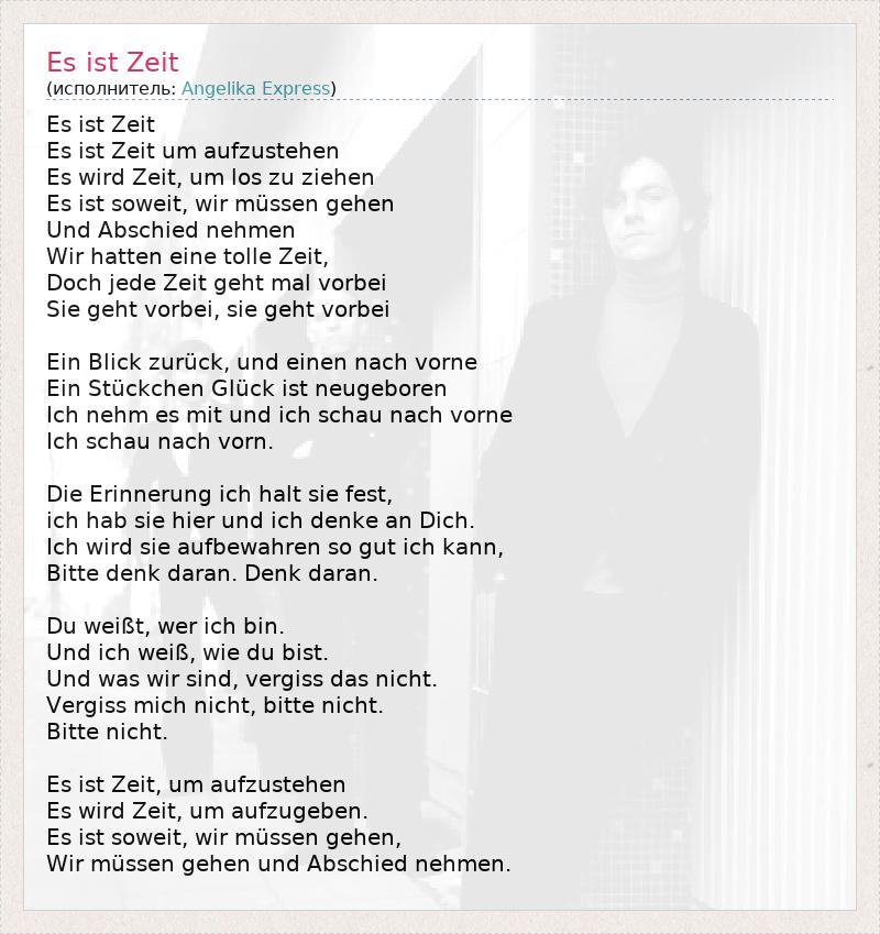 Es ist Zeit Es ist Zeit um aufzustehen Es wird Zeit, um los zu ziehen Es ist soweit, wir müssen gehen Und Abschied nehmen Wir hatten eine tolle Zeit, Doch jede Zeit geht mal vorbei Sie geht vorbei, sie geht vorbei Ein Blick zurück, und einen nach vorne Ein Stückchen Glück ist neugeboren Ich nehm es mit und ich schau nach vorne Ich schau nach vorn. Die Erinnerung ich halt sie fest, ich hab sie hier und ich denke an Dich. Ich wird sie aufbewahren so gut ich kann, Bitte denk daran. Denk daran. Du weißt, wer ich bin. Und ich weiß, wie du bist. Und was wir sind, vergiss das nicht. Vergiss mich nicht, bitte nicht. Bitte nicht. Es ist Zeit, um aufzustehen Es wird Zeit, um aufzugeben. Es ist soweit, wir müssen gehen, Wir müssen gehen und Abschied nehmen.