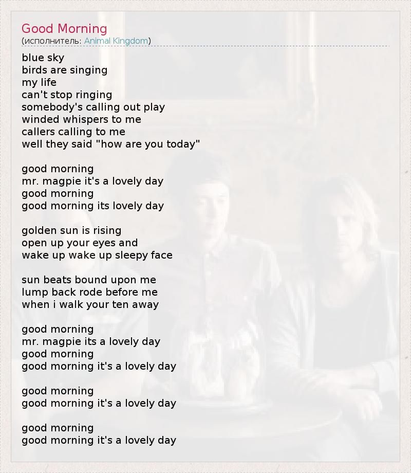 blue sky birds are singing my life can't stop ringing somebody's calling out play winded whispers to me callers calling to me well they said "how are you today" good morning mr. magpie it's a lovely day good morning good morning its lovely day golden sun is rising open up your eyes and wake up wake up sleepy face sun beats bound upon me lump back rode before me when i walk your ten away good morning mr. magpie its a lovely day good morning good morning it's a lovely day good morning good morning it's a lovely day good morning good morning it's a lovely day