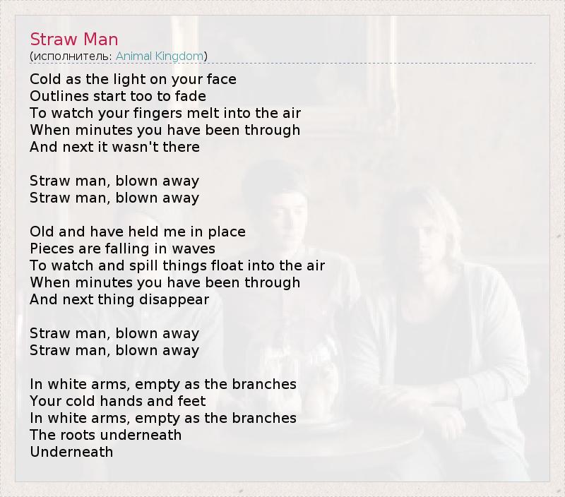 Cold as the light on your face Outlines start too to fade To watch your fingers melt into the air When minutes you have been through And next it wasn't there Straw man, blown away Straw man, blown away Old and have held me in place Pieces are falling in waves To watch and spill things float into the air When minutes you have been through And next thing disappear Straw man, blown away Straw man, blown away In white arms, empty as the branches Your cold hands and feet In white arms, empty as the branches The roots underneath Underneath