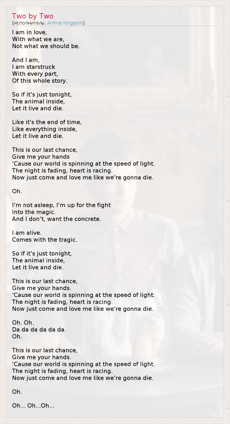 Мне нравится, Кем мы являемся, А не то, кем мы должны быть. И я, Я фанатею От каждой части Этой истории. Если только сегодня ночью Животное внутри тебя, Позволь ему прожить и умереть. Это как конец времён, Всему, что внутри - Позволь этому прожить и умереть... Это наш последний шанс - Дай мне свои руки, Потому что наш мир вращается со скоростью света, Ночь заканчивается, а сердце бьется так быстро... А теперь просто подойди и люби меня так, как будто мы скоро умрем. Оу... Я не сплю, я готова сражаться, Связаться с магией. И я не хочу останавливаться. Я жива, Осознаю я с ужасом. Если только сегодня ночью Животное внутри тебя, Позволь ему прожить и умереть. Это наш последний шанс - Дай мне свои руки, Потому что наш мир вращается со скоростью света, Ночь заканчивается, а сердце бьется так быстро... А теперь просто подойди и люби меня так, как будто мы скоро умрем. Оу, оу, Да да да да да да. Оу. Это наш последний шанс - Дай мне свои руки, Потому что наш мир вращается со скоростью света, Ночь заканчивается, а сердце бьется так быстро... А теперь просто подойди и люби меня так, как будто мы скоро умрем. Оу Оу... Оу... Оу...