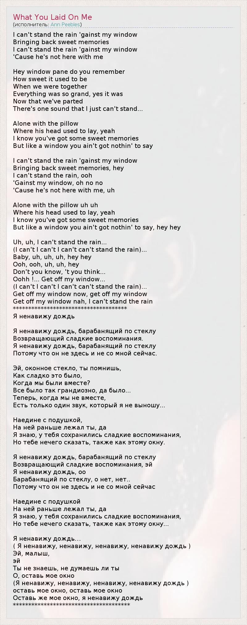 I can't stand the rain 'gainst my window Bringing back sweet memories I can't stand the rain 'gainst my window 'Cause he's not here with me Hey window pane do you remember How sweet it used to be When we were together Everything was so grand, yes it was Now that we've parted There's one sound that I just can't stand... Alone with the pillow Where his head used to lay, yeah I know you've got some sweet memories But like a window you ain't got nothin' to say I can't stand the rain 'gainst my window Bringing back sweet memories, hey I can't stand the rain, ooh 'Gainst my window, oh no no 'Cause he's not here with me, uh Alone with the pillow uh uh Where his head used to lay, yeah I know you've got some sweet memories But like a window you ain't got nothin' to say, hey hey Uh, uh, I can't stand the rain... (I can't I can't I can't can't stand the rain)... Baby, uh, uh, uh, hey hey Ooh, ooh, uh, uh, hey Don't you know, 't you think... Oohh !... Get off my window... (I can't I can't I can't can't stand the rain)... Get off my window now, get off my window Get off my window nah, I can't stand the rain ************************************* Я ненавижу дождь Я ненавижу дождь, барабанящий по стеклу Возвращающий сладкие воспоминания. Я ненавижу дождь, барабанящий по стеклу Потому что он не здесь и не со мной сейчас. Эй, оконное стекло, ты помнишь, Как сладко это было, Когда мы были вместе? Все было так грандиозно, да было... Теперь, когда мы не вместе, Есть только один звук, который я не выношу... Наедине с подушкой, На ней раньше лежал ты, да Я знаю, у тебя сохранились сладкие воспоминания, Но тебе нечего сказать, также как этому окну. Я ненавижу дождь, барабанящий по стеклу Возвращающий сладкие воспоминания, эй Я ненавижу дождь, оо Барабанящий по стеклу, о нет, нет.. Потому что он не здесь и не со мной сейчас Наедине с подушкой На ней раньше лежал ты, да Я знаю, у тебя сохранились сладкие воспоминания, Но тебе нечего сказать, также как этому окну... Я ненавижу дождь… ( Я ненавижу, ненавижу, ненавижу, ненавижу дождь ) Эй, малыш, эй Ты не знаешь, не думаешь ли ты О, оставь мое окно (Я ненавижу, ненавижу, ненавижу, ненавижу дождь ) оставь мое окно, оставь мое окно Оставь же мое окно, я ненавижу дождь **************************************