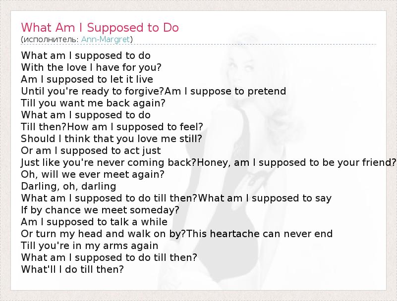 What am I supposed to do With the love I have for you? Am I supposed to let it live Until you're ready to forgive?Am I suppose to pretend Till you want me back again? What am I supposed to do Till then?How am I supposed to feel? Should I think that you love me still? Or am I supposed to act just Just like you're never coming back?Honey, am I supposed to be your friend? Oh, will we ever meet again? Darling, oh, darling What am I supposed to do till then?What am I supposed to say If by chance we meet someday? Am I supposed to talk a while Or turn my head and walk on by?This heartache can never end Till you're in my arms again What am I supposed to do till then? What'll I do till then?