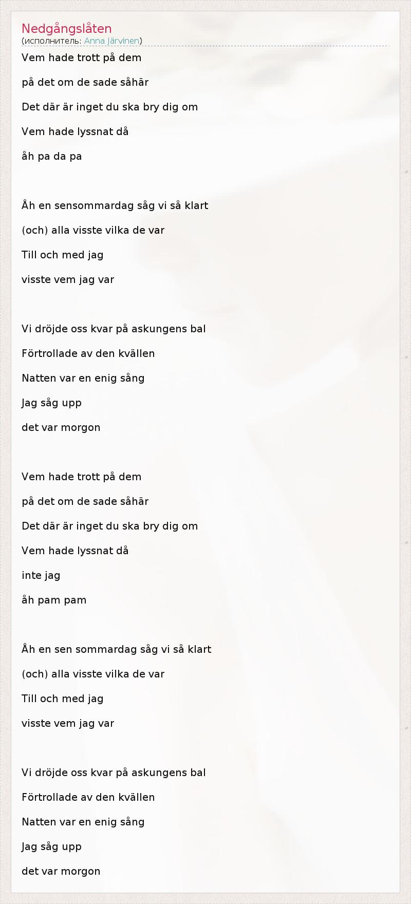 Vem hade trott på dem på det om de sade såhär Det där är inget du ska bry dig om Vem hade lyssnat då åh pa da pa Åh en sensommardag såg vi så klart (och) alla visste vilka de var Till och med jag visste vem jag var Vi dröjde oss kvar på askungens bal Förtrollade av den kvällen Natten var en enig sång Jag såg upp det var morgon Vem hade trott på dem på det om de sade såhär Det där är inget du ska bry dig om Vem hade lyssnat då inte jag åh pam pam Åh en sen sommardag såg vi så klart (och) alla visste vilka de var Till och med jag visste vem jag var Vi dröjde oss kvar på askungens bal Förtrollade av den kvällen Natten var en enig sång Jag såg upp det var morgon