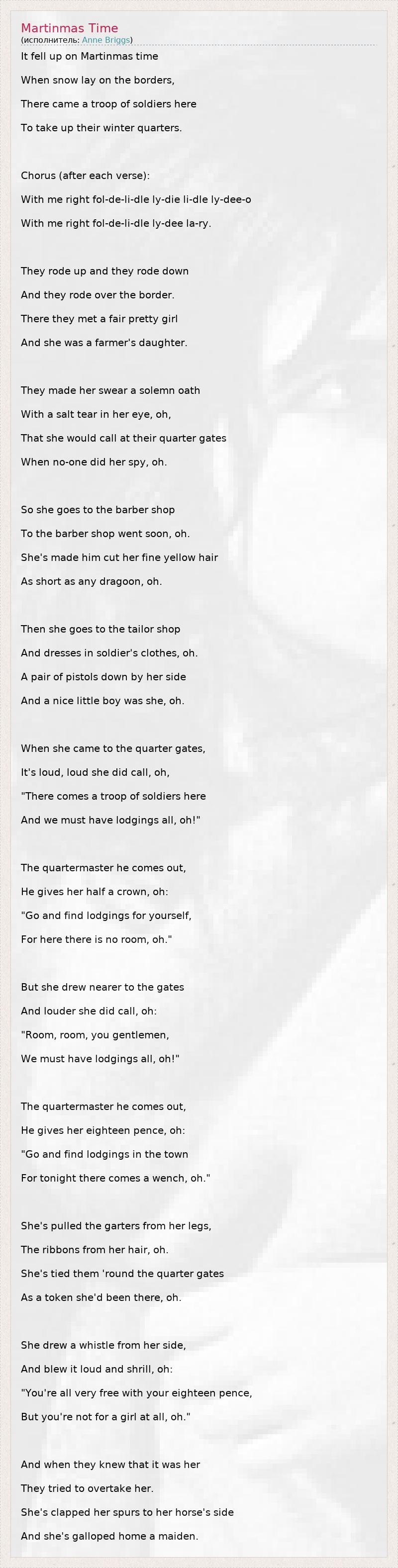 It fell up on Martinmas time When snow lay on the borders, There came a troop of soldiers here To take up their winter quarters. Chorus (after each verse): With me right fol-de-li-dle ly-die li-dle ly-dee-o With me right fol-de-li-dle ly-dee la-ry. They rode up and they rode down And they rode over the border. There they met a fair pretty girl And she was a farmer's daughter. They made her swear a solemn oath With a salt tear in her eye, oh, That she would call at their quarter gates When no-one did her spy, oh. So she goes to the barber shop To the barber shop went soon, oh. She's made him cut her fine yellow hair As short as any dragoon, oh. Then she goes to the tailor shop And dresses in soldier's clothes, oh. A pair of pistols down by her side And a nice little boy was she, oh. When she came to the quarter gates, It's loud, loud she did call, oh, "There comes a troop of soldiers here And we must have lodgings all, oh!" The quartermaster he comes out, He gives her half a crown, oh: "Go and find lodgings for yourself, For here there is no room, oh." But she drew nearer to the gates And louder she did call, oh: "Room, room, you gentlemen, We must have lodgings all, oh!" The quartermaster he comes out, He gives her eighteen pence, oh: "Go and find lodgings in the town For tonight there comes a wench, oh." She's pulled the garters from her legs, The ribbons from her hair, oh. She's tied them 'round the quarter gates As a token she'd been there, oh. She drew a whistle from her side, And blew it loud and shrill, oh: "You're all very free with your eighteen pence, But you're not for a girl at all, oh." And when they knew that it was her They tried to overtake her. She's clapped her spurs to her horse's side And she's galloped home a maiden.