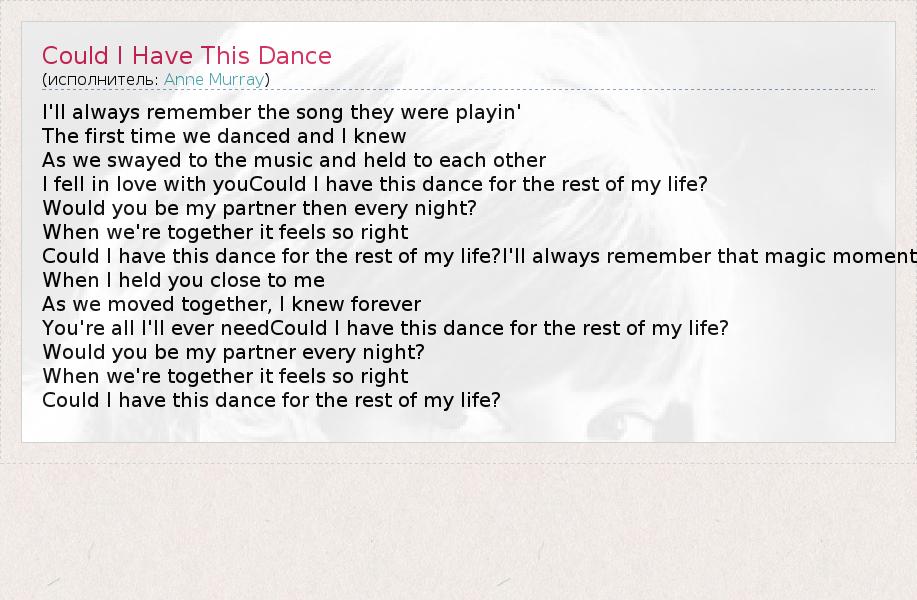 А как ты думаешь, о чем песня "Could I Have This Dance" ?